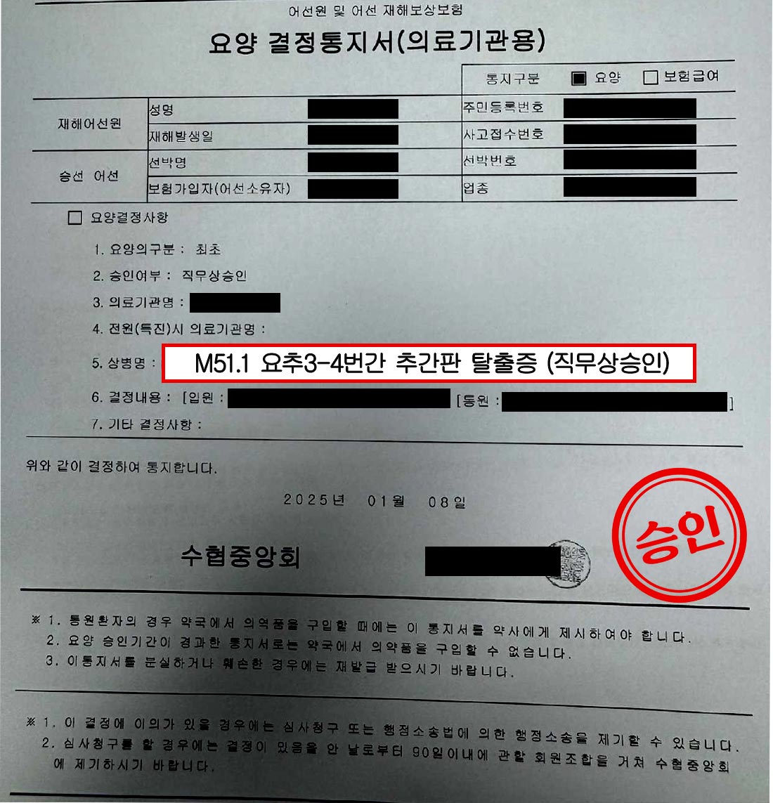 수협중앙회는 의뢰인에게 개인적 소인인 척추분리증이 있었던 점은 인정하면서도, 50년이 넘는 기간 동안 수행한 어선원 업무의 높은 부담이 추간판 탈출증을 유발하고 악화시킨 주된 요인이었음을 받아들였습니다.