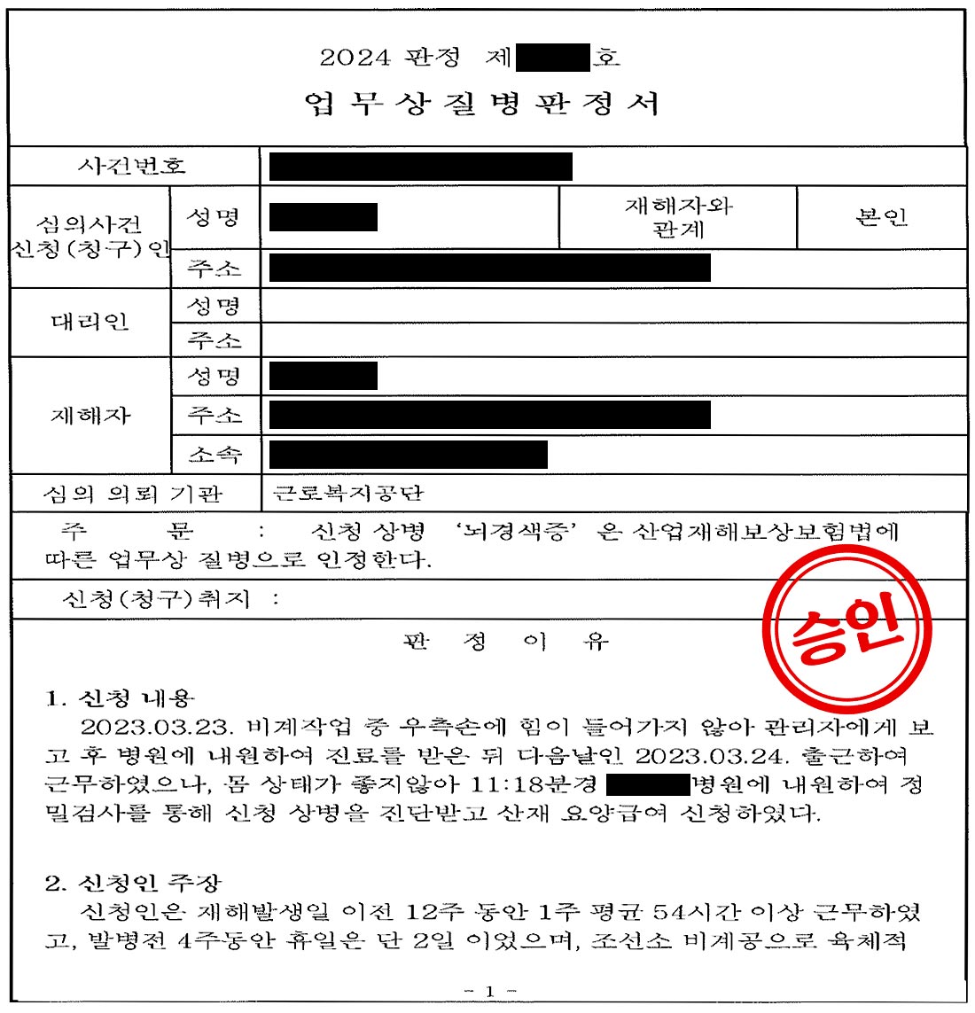 위원회는 의뢰인의 신체조건, 업무내용, 근무시간, 진료기록 등 조사된 내용 전반을 종합 심의하였습니다. 그 결과, 의뢰인의 '뇌경색증'은 산업재해보상보험법 제37조 제1항 제2호에 따른 업무상 질병으로 최종 승인되었습니다.