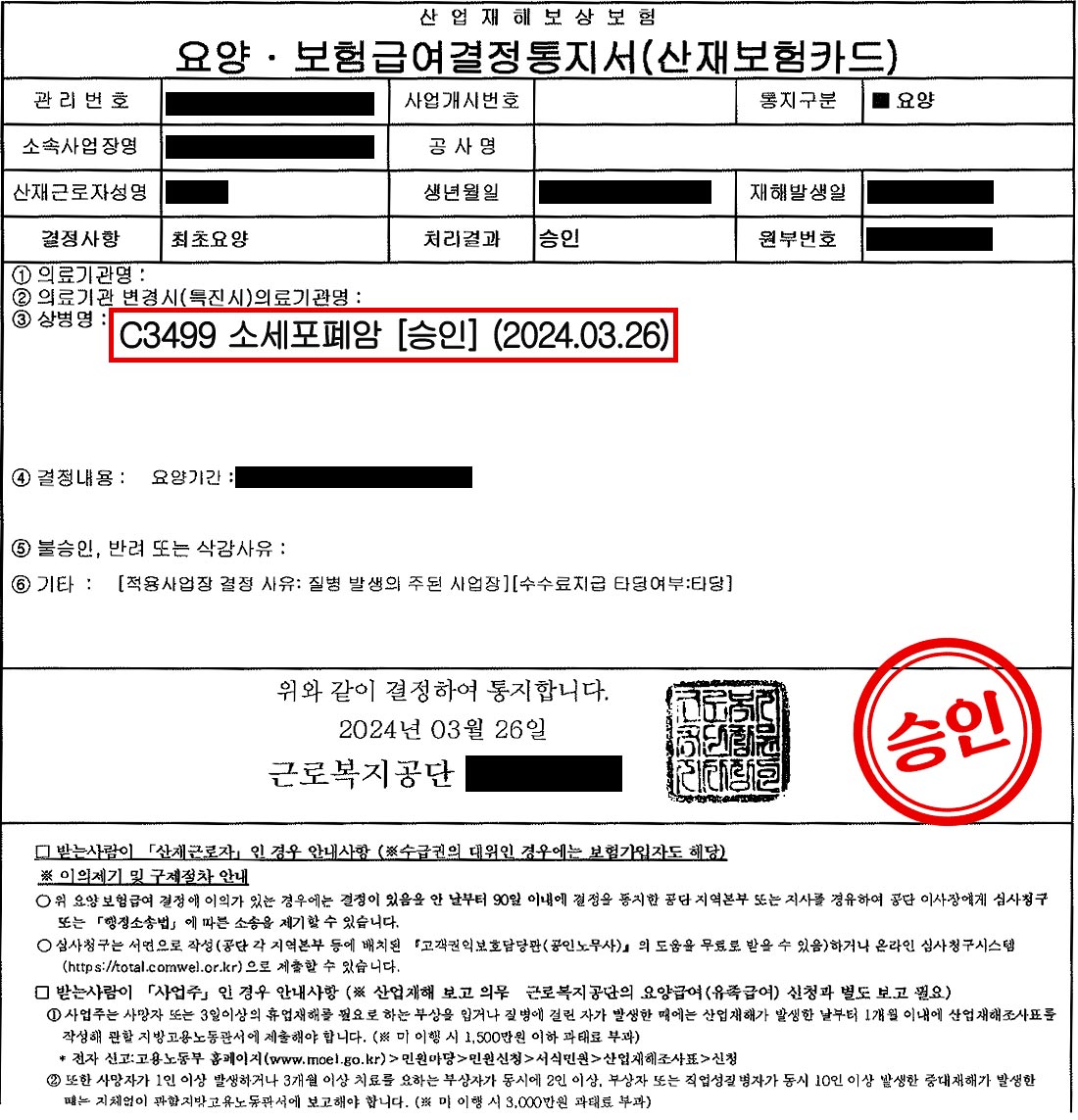 위원회는 신청인의 업무내용과 기간, 업무상 유해요인, 발병 경위, 과거 병력, 연령 등을 종합적으로 검토하였습니다. 그 결과, 신청인의 '소세포폐암'은 산업재해보상보험법 제37조 제1항 제2호에 따른 업무상 질병으로 최종 승인되었습니다.