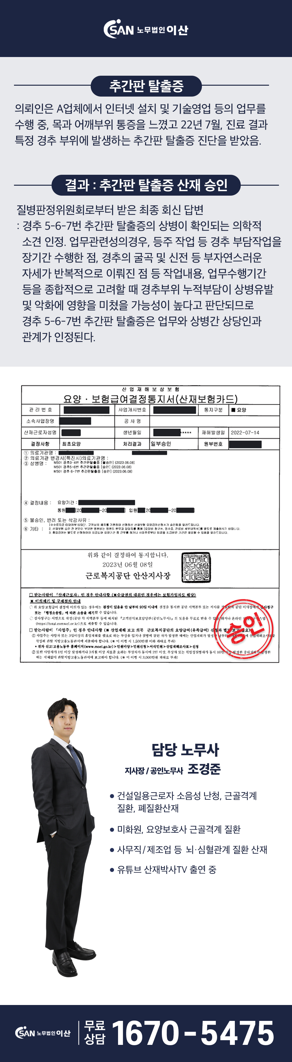 인터넷 설치 및 기술영업 근로자 - 추간판 탈출증 산재승인!