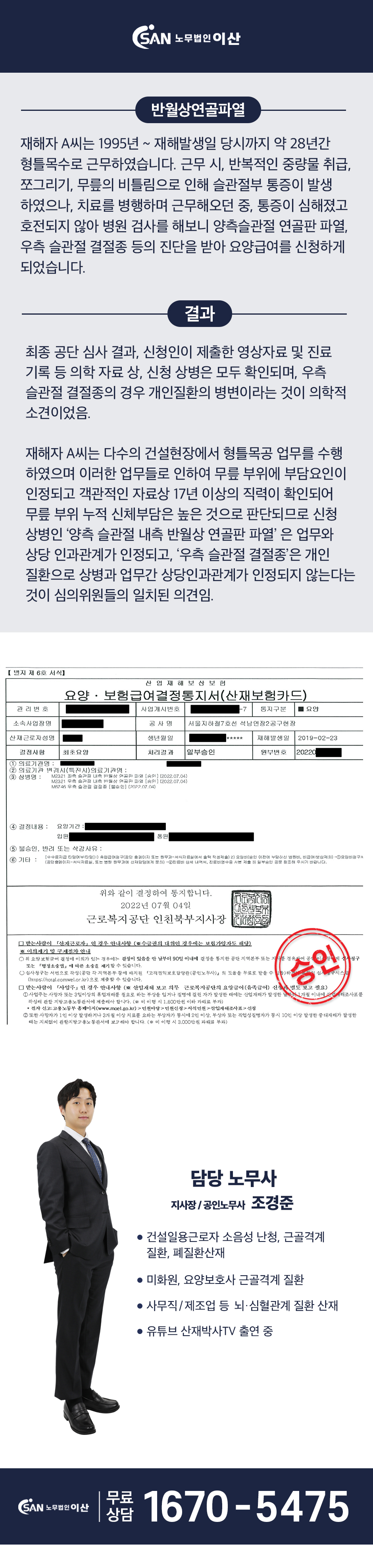 형틀목공 - 근골격계 질환 (반월상 연골파열) 산재 승인!