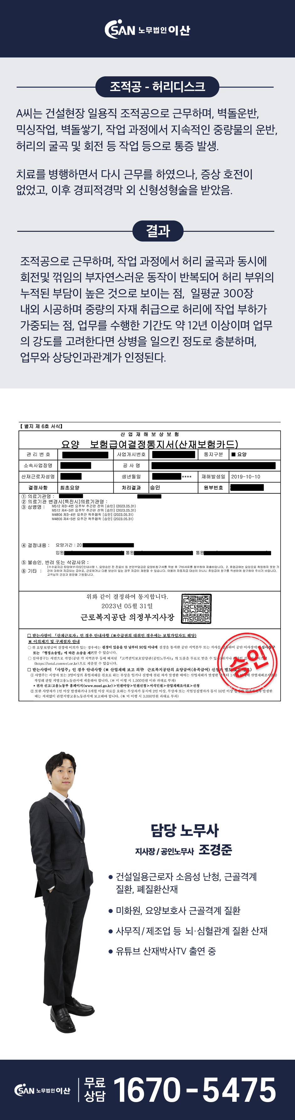 조적공 - 허리 디스크 (요추 부 질환) 산재승인!