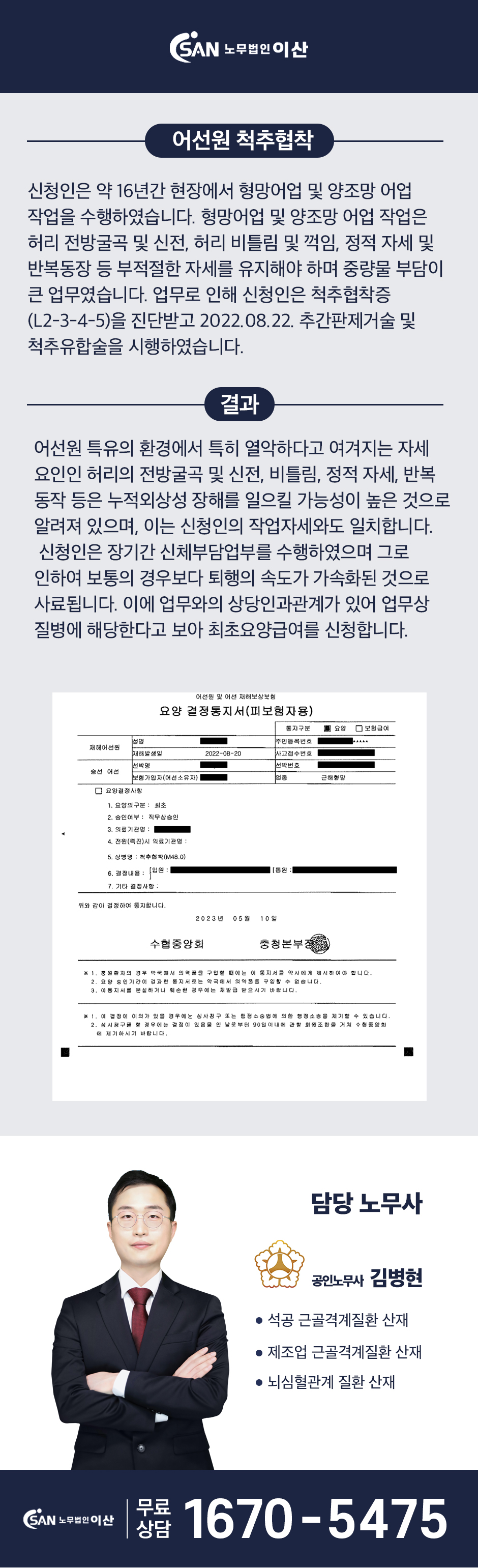 어선원의 허리디스크, 누가 어떻게 산재로 인정할까? 육지 근로자의 재해는 ‘산업재해보상보험’으로, 바다 위 어선원의 재해는 ‘어선원재해보상보험’으로 처리됩니다. 이름은 비슷하지만, 그 안을 들여다보면 재해를 심사하고 결정하는 방식에 중요한 차이가 있습니다. 그 차이를 아는 것이 때로는 사건의 승패를 가르기도 합니다. 오늘은 장기간 어선원으로 일해 온 근로자의 허리 질환이, 일반 산재와는 다른 ‘어선원재해보험’의 특별한 심사 과정을 거쳐 직무상 재해로 인정된 사례를 소개해 드리고자 합니다. Ⅰ. 사건의 배경 의뢰인은 평생을 바다와 함께 살아온 어선원이었습니다. 흔들리는 배 위에서 무거운 그물과 어구를 당기고, 허리를 숙여 어획물을 정리하는 작업을 수십 년간 반복한 결과, 그의 허리에는 만성적인 통증이 자리 잡았습니다. 결국 병원에서 ‘요추부 협착증(L4-5)’과 ‘요추 추간판탈출증(L4-5)’이라는 진단을 받게 되었습니다. Ⅱ. 사건의 쟁점 및 해결방법 1. 쟁점: ‘위원회’가 아닌 ‘다수 전문의’를 설득하라 이번 사건의 핵심 과제는, 어선원재해보험의 독특한 의사 결정 구조를 이해하고 그에 맞는 전략을 세우는 것이었습니다. ∙ 일반 산재의 ‘업무상질병판정위원회’ 우리가 흔히 아는 산재보험은, 직업성 질병의 인정 여부를 여러 분야의 전문가들이 한자리에 모이는 ‘업무상질병판정위원회’라는 단일 위원회에서 결정합니다. ∙ 어선원재해의 ‘다수 전문의 자문 시스템’ 하지만 어선원재해는 조금 다릅니다. 이 제도는 위원회 심의 방식이 아닌, 수협에서 정형외과, 신경외과, 직업환경의학과 등 각 분야의 전문의들에게 개별적으로 의료 자문을 구하고, 그 여러 소견을 종합하여 재해 인정 여부를 결정하는 방식을 취하는 경우가 많습니다. 즉, 한 번의 위원회를 설득하는 것이 아니라, 각기 다른 관점을 가진 여러 명의 전문의 모두로부터 긍정적인 평가를 받아내야 하는, 더 다각적이고 깊이 있는 접근이 필요했습니다. 2. 해결방법: 각 분야 전문의를 위한 맞춤형 논리 구축 이러한 심사 방식의 차이를 고려하여, 각 분야 전문의의 관점에서 모두 타당하다고 인정할 수 있는 입체적인 논리를 구축하는 데 집중했습니다. ∙ 정형외과적·신경외과적 관점 흔들리는 배 위에서 무거운 물건을 반복적으로 취급하는 작업이 척추의 정렬에 어떤 영향을 미치고, 척추 마디마디의 퇴행성 변화를 어떻게 가속화시키는지 그 역학적 관계를 설명했습니다. 또한 MRI 등 영상 자료를 바탕으로, 탈출된 디스크와 좁아진 척추관이 어떻게 신경을 직접적으로 압박하여 통증과 저림을 유발하는지를 명확히 했습니다. ∙ 직업환경의학과적 관점 어선원이라는 직업군에서 허리 질환이 얼마나 빈번하게 발생하는지, 그리고 의뢰인의 오랜 조업 경력과 업무 강도가 질병을 유발하기에 충분하다는 점을 직업과 질병의 연관성 측면에서 종합적으로 주장했습니다. 이처럼 하나의 사건을 여러 의료 전문가의 시선으로 다각도에서 분석하고, 어느 관점에서 보아도 업무 관련성의 설득력을 잃지 않도록 사건의 서류를 구성하는 것이 이 사건의 핵심 전략이었습니다. Ⅲ. 사건수행 결과 수협은 정형외과, 신경외과, 직업환경의학과 등 여러 분야의 의료 자문 결과를 종합하였고, 그 결과 의뢰인의 허리 질환이 업무와의 인과관계가 높다는 공통된 소견을 확인할 수 있었습니다. 이를 바탕으로, 의뢰인의 ‘요추부 협착증(L4-5)’ 및 ‘요추 추간판탈출증(L4-5)’은 직무상 질병으로 최종 승인되었습니다. Ⅳ. 산재전문노무사 의견 이번 사례는 산재 사건의 승패가 단순히 ‘얼마나 일이 힘들었는가’를 넘어, ‘누가, 어떤 방식으로 그 힘듦을 판단하는가’를 이해하는 데서 갈릴 수 있음을 명확히 보여줍니다. 단일 위원회를 설득하는 전략과, 각기 다른 분야의 전문의 여러 명을 동시에 설득하는 전략은 분명 달라야 합니다. 특히 어선원 등 특수한 직업군에 속한 분들이라면, 나의 재해를 다루는 제도가 일반 산재와 어떻게 다른지 그 특수성을 정확히 파악하는 것이 무엇보다 중요합니다. 해당 제도의 절차와 특성에 대한 깊은 이해를 바탕으로 최적의 길을 찾아 나아갈 때, 비로소 정당한 권리에 더 가까이 다가설 수 있을 것입니다.