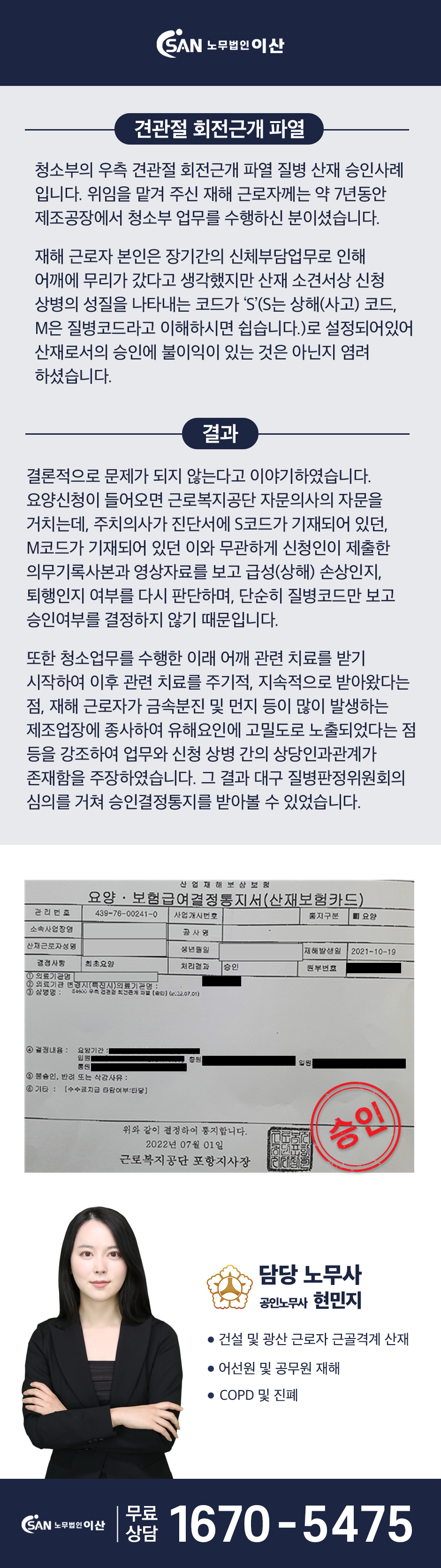 청소 근로자 - 견관절 회전근개 파열, 산재 승인!