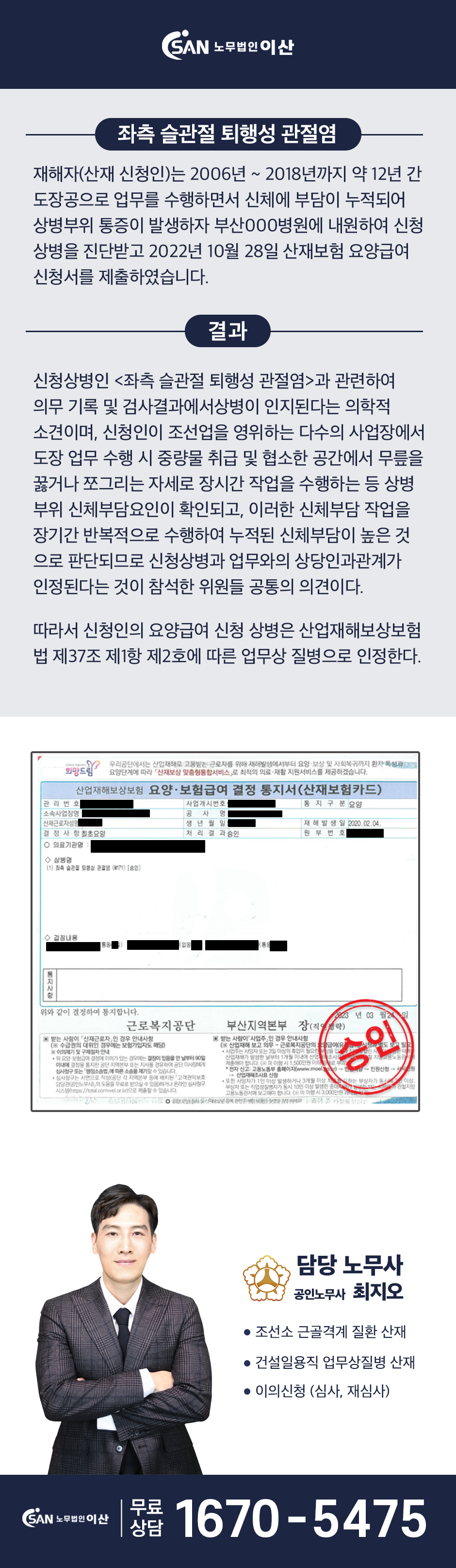 조선소 도장공 근로자 - 좌측 슬관절 퇴행성 관절염 산재승인!