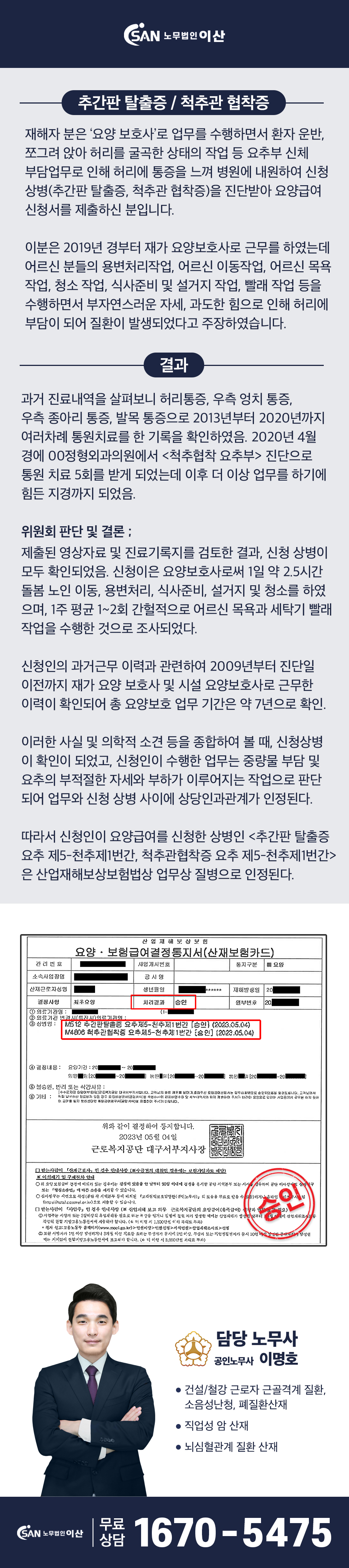 요양보호사 산재 승인! - 근골격계 질환 <추간판 탈출증, 척추관 협착증>