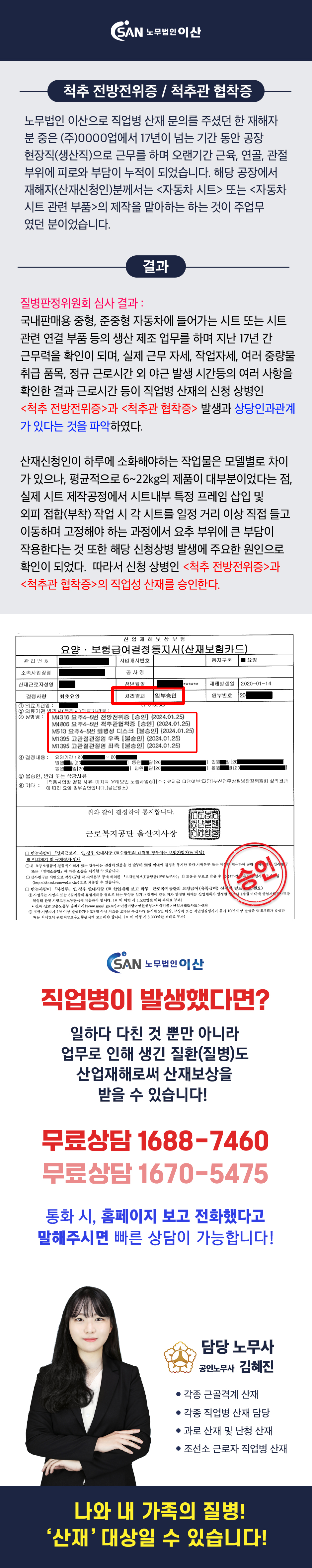 자동차 시트제작 생산직 근로자 - <전방전위증>, <척추관 협착증> 직업병 산재 승인 사례!