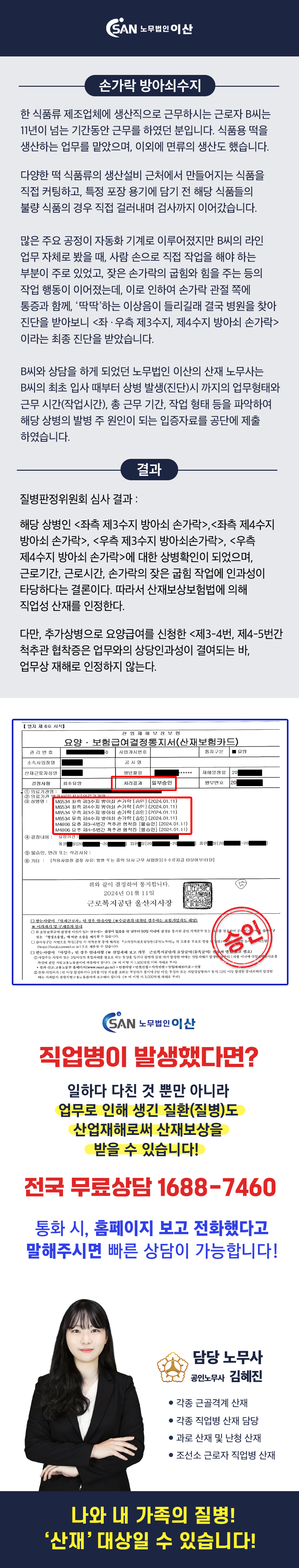 식품류 생산공장 생산직 근로자 - 손가락 방아쇠수지 진단 → 직업병 산재 승인사례!