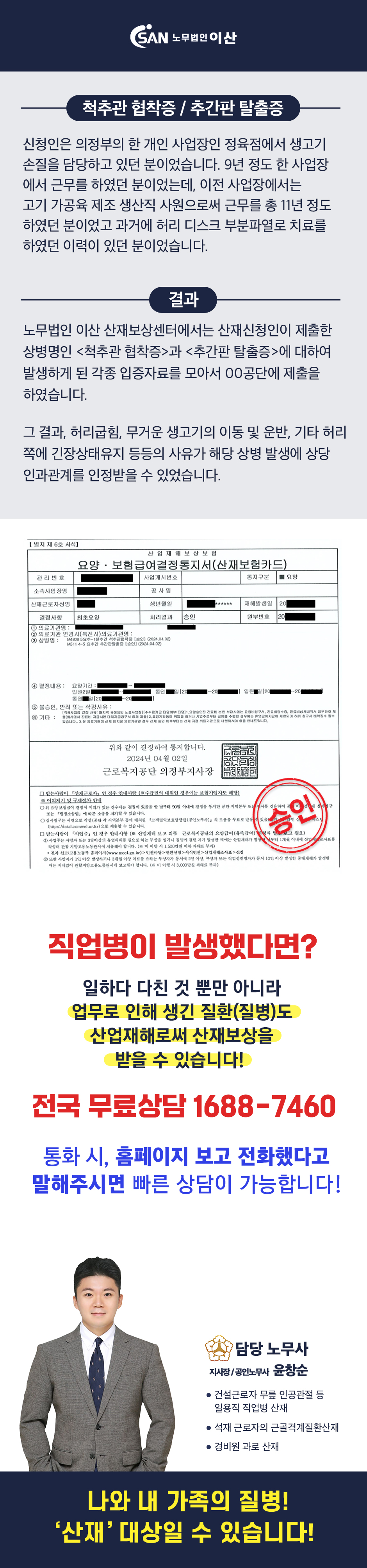 정육점 고기 절단 및 기타 손질 근무자 - <척추관 협착증 / 추간판 탈출증> 직업병산재 승인 사례