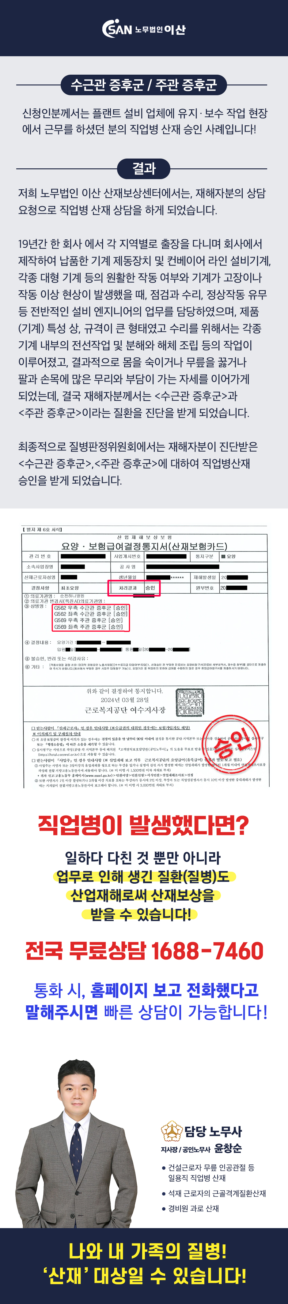000 플랜트 기계설비, 유지 · 보수 작업자 - <수근관 증후군>, <주관 증후군> 직업병 산재승인 사례