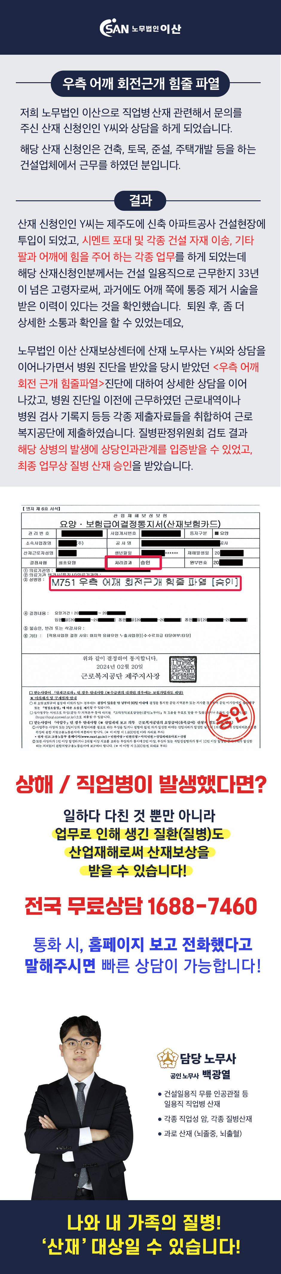 건설현장 일용직 근로자 직업병산재 승인사례 - 우측 <어깨 회전근개힘줄 파열>
