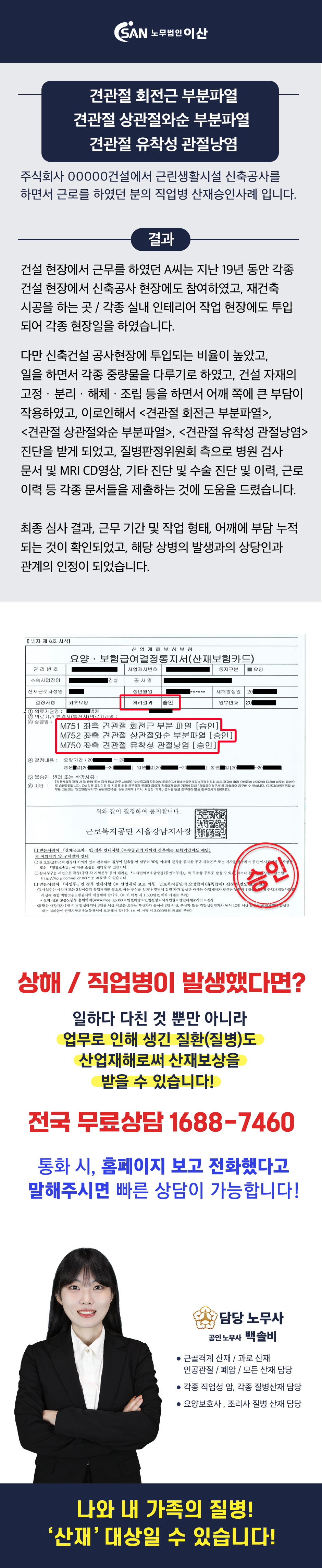 건설현장 근로자 - <견관절 회전근 부분파열>, <견관절 상관절와순 부분파열>, <견관절 유착성 관절낭염> 직업병 산재승인!