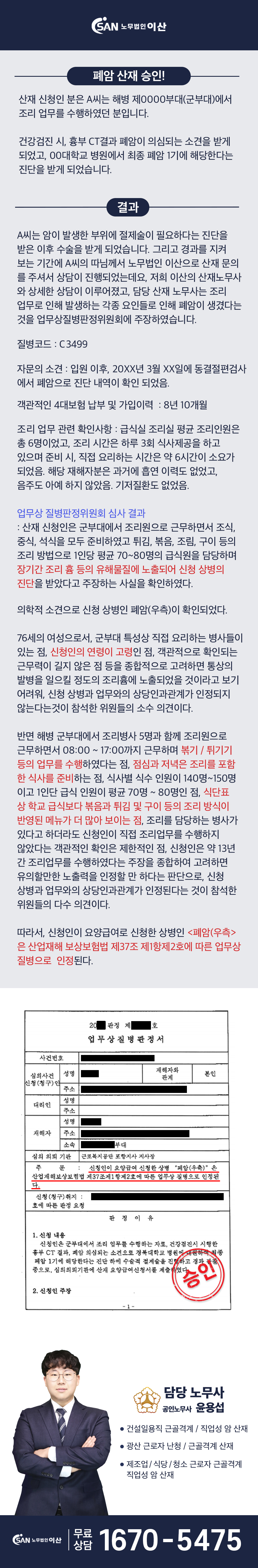 건설현장 인테리어공 폐암 산재 승인 사례 건설현장 인테리어공 폐암 산재 승인 사례 안녕하세요, 산재전문 노무법인 이산입니다. 건설현장은 다양한 공정이 동시에 이루어지는 공간입니다. 특히 인테리어 공사는 마감 단계에 속하지만, 그 과정에서 용접, 절단, 파쇄 등 여러 작업이 함께 이루어집니다. 오늘 소개해 드릴 사례는 건설현장에서 인테리어공으로 근무하시던 고인이 폐암 진단을 받은 후, 유족이 산재를 신청하여 업무상 질병으로 인정받은 사건입니다. Ⅰ. 사건의 배경 고인은 오랜 기간 건설현장에서 인테리어 및 내장 공사 업무를 수행해 왔습니다. 작업 내용에는 창호 시공, 용접 업무, 실내 마감 작업 등이 포함되어 있었고, 공정에 따라 다양한 작업 환경을 경험하였습니다. 폐암 진단 이후 치료가 이어졌으나, 고인은 끝내 세상을 떠났습니다. 남겨진 유족은 고인의 업무와 질병 사이의 관련성을 밝히기 위해 산재 절차를 시작하였습니다. Ⅱ. 사건의 쟁점 및 해결방법1. “실내 인테리어 작업인데도 유해물질 노출이 인정될 수 있을까요?”쟁점 : 위원회에서는 고인의 주 업무를 ‘실내 인테리어 작업’으로 보았습니다. 이에 따라 용접 흄이나 유해 분진에 대한 노출 수준이 충분했는지가 쟁점이 되었습니다. 해결 전략 :저희는 인테리어 공사가 단순한 마감 작업에 그치지 않는다는 점을 설명했습니다. 현장 상황에 따라 콘크리트 파쇄 작업이 이루어질 수 있고, 이 과정에서 결정형 유리규산에 노출될 가능성이 있다는 점, 또한 실내 공간에서 용접 작업이 이루어질 경우 고농도 용접 흄에 노출될 수 있다는 점을 구체적으로 정리했습니다. 2. “경력 기간을 어떻게 평가해야 할까요?”쟁점 :객관적으로 확인되는 건설근로 경력 자료와, 청구인이 주장하는 전체 직업력 사이에는 차이가 있었습니다. 경력의 범위와 기간을 어떻게 볼 것인지가 판단의 중요한 요소였습니다. 해결 전략 :저희는 건설근로자 경력증명서, 고용보험 일용근로 내역, 원천징수 자료 등을 종합하여 고인의 건설업 종사 이력을 정리했습니다. 특히 인테리어 및 용접 관련 업무 내용이 반복적으로 확인된다는 점을 강조하며, 장기간 관련 직무에 종사하였음을 설명했습니다. 3. “폐암과 업무 사이의 인과관계는 어떻게 판단되었나요?”쟁점 :소수 위원은 고인의 업무가 폐암을 유발하거나 악화시켰다고 보기 어렵다는 의견을 제시하였습니다. 노출 기간과 수준을 엄격하게 해석한 결과였습니다. 해결 전략 :반면 다수 위원은 다음과 같은 점을 종합적으로 고려하였습니다.- 인테리어 및 내장 공사 과정에서 발생 가능한 분진 노출- 실내 작업 특성상 용접 흄이 체류할 수 있는 환경- 관련 직무에 장기간 종사한 점이러한 사정을 종합하면 업무와 폐암 사이의 상당인과관계를 인정할 수 있다는 판단이 내려졌습니다. Ⅲ. 사건수행 결과 위원회는 고인의 업무 내용, 근무 형태, 작업 환경, 연령 및 건강 상태, 과거 병력, 의무기록과 영상자료, 재해조사서 및 전문 자문 의견 등을 종합적으로 검토하였습니다. 그 결과, 고인의 상병인 ‘상세불명의 기관지 또는 폐의 악성 신생물’은 업무와 상당인과관계가 인정되어 산업재해보상보험법에 따른 업무상 질병으로 승인되었습니다. 이에 따라 유족은 관련 급여를 지급받을 수 있게 되었습니다. Ⅳ. 산재전문노무사 의견 건설현장의 인테리어 작업은 겉으로 보기에는 비교적 정돈된 공정처럼 보일 수 있습니다. 그러나 실제로는 다양한 공정과 맞물려 유해요인에 노출될 가능성이 존재합니다. 이번 사건은 단순히 ‘실내 작업’이라는 이유만으로 업무 관련성을 배제할 수 없다는 점을 보여준 사례입니다. 작업의 실제 내용과 환경을 얼마나 구체적으로 설명하느냐가 판단의 핵심이었습니다. 유족의 용기 있는 결정과, 자료를 하나씩 정리해 나간 과정이 결국 승인으로 이어졌습니다.