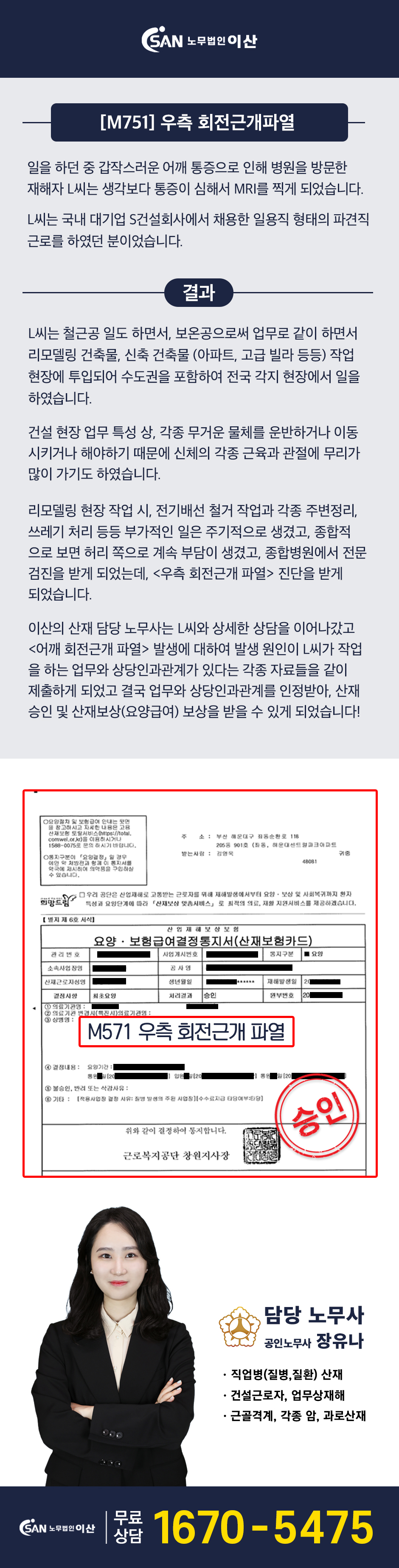 대기업 건설현장 근로자 (일용직 산재) - < M571 우측 회전근개파열 > 산재 승인사례!