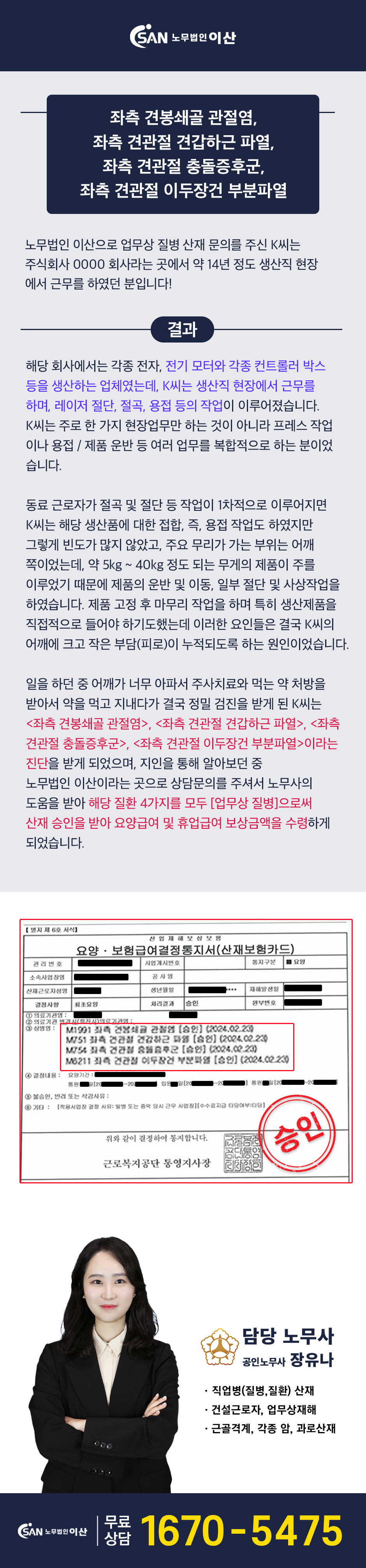 전자,전기 관련 용품 생산직 어깨 산재 - 견봉쇄골 관절염, 견관절 견갑하근 파열, 견관절 충돌증후군 산재승인, 견관절 이두장건 부분파열 승인!