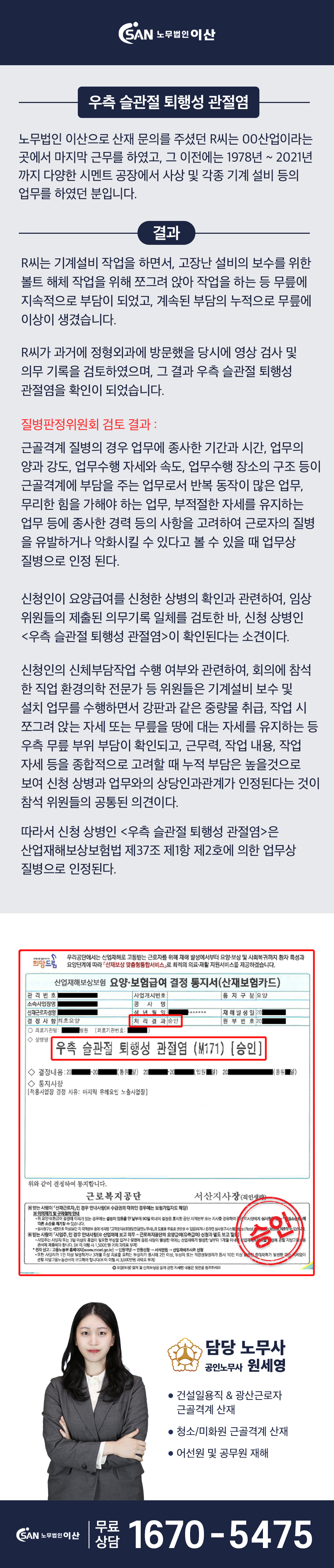 시멘트 공장 사상공 / 각종 기계설비 · 보수 현장직 근골격계 질환 - <우측 슬관절 퇴행성 관절염> 산재 승인!