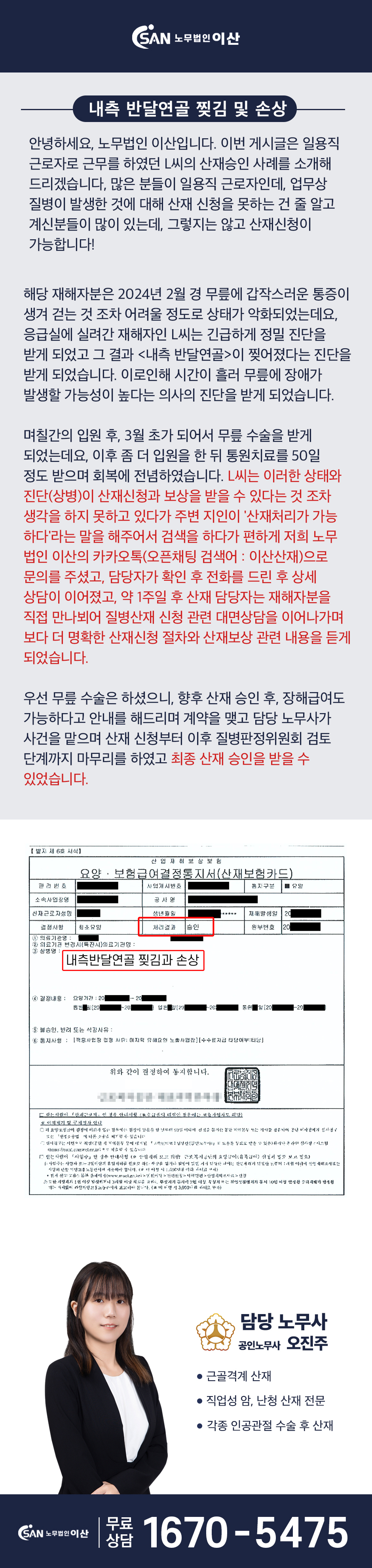 건설일용직 견출공(견출작업) 근로자, 일하다가 <내측반달연골 찢김과 손상>발생! 최종 산재 승인!
