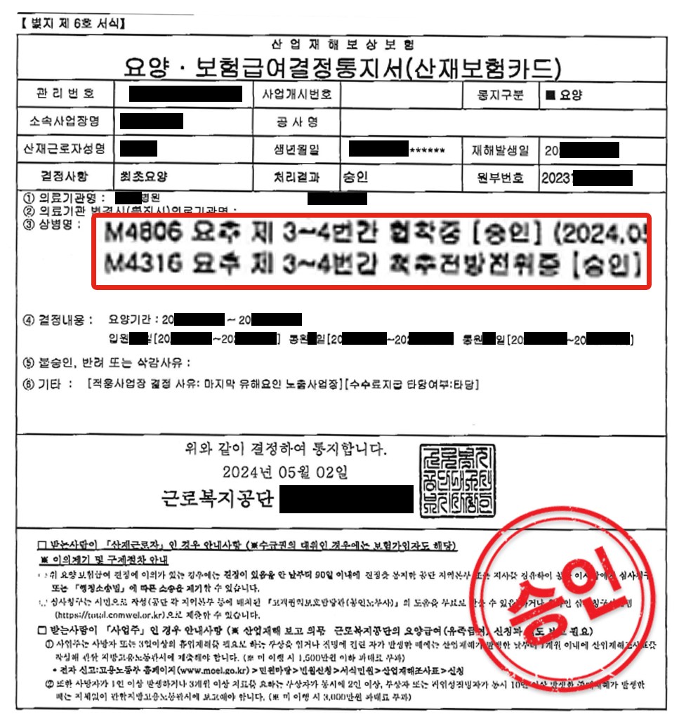 그 결과, 의뢰인의 '요추 제3-4번간 협착증 및 척추전방전위증'은 업무상 질병으로 최종 인정되었습니다.