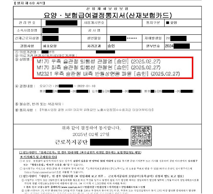 그 결과, 신청 상병인 ‘우측 슬관절 퇴행성 관절염’ , ‘좌측 슬관절 퇴행성 관절염’ , ‘우측 슬관절 내측 반월상연골 파열’ 은 모두 업무상 질병으로 최종 승인되었습니다.