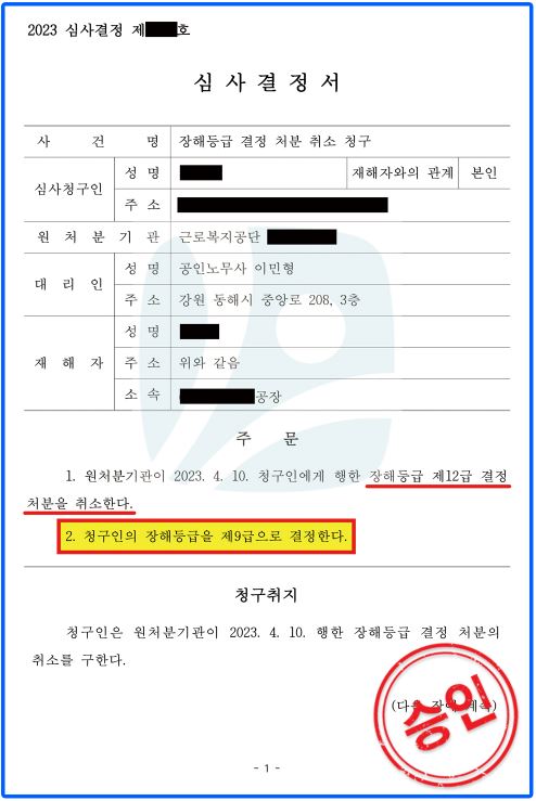 결론적으로, 근로복지공단이 의뢰인에게 행한 장해등급 제12급 결정 처분은 취소되었고, 장해등급은 제9급으로 변경 결정되었습니다.