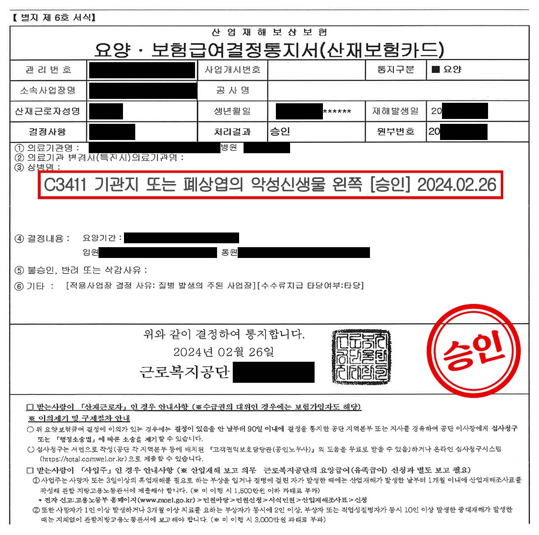 업무상질병판정위원회는 의뢰인의 폐암과 업무 사이의 상당인과관계를 인정하고 최종적으로 '업무상 질병'으로 승인 결정을 내렸습니다.