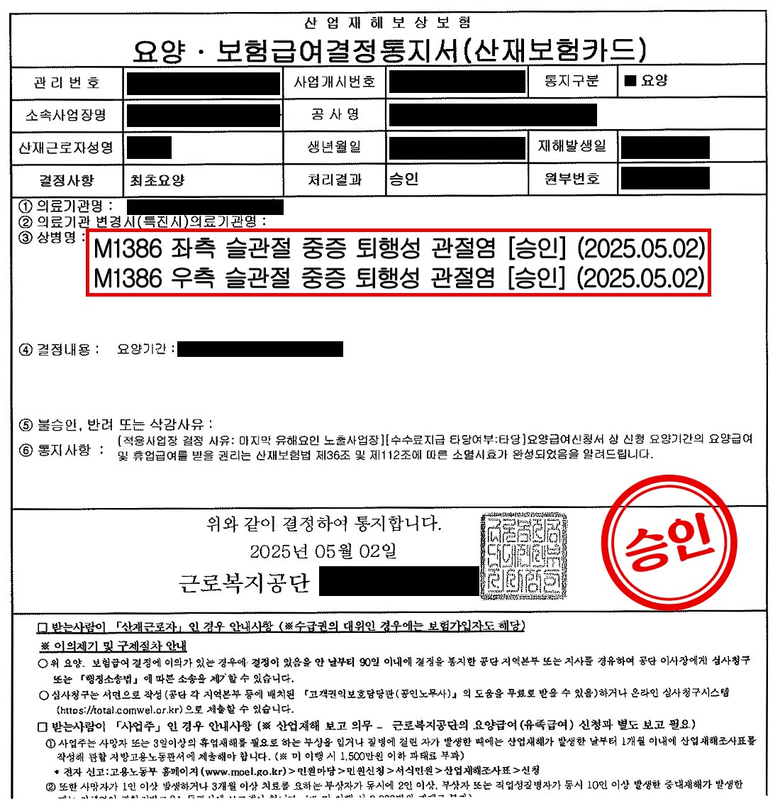 비만과 관절염, 퇴행성 질환의 원인은 하나뿐일까? 비만과 관절염, 퇴행성 질환의 원인은 하나뿐일까? “제가 체중이 좀 나가는데, 무릎 관절염 산재가 될까요?” 퇴행성 관절염 산재를 상담할 때, ‘나이’ 다음으로 가장 많이 듣는, 그리고 근로자분들이 가장 우려하는 부분입니다. 비만이 무릎 관절염의 주요한 개인적 위험 요인이라는 것은 널리 알려진 사실이기 때문입니다. 오늘 노무법인 이산에서는, 비만이라는 개인적 요인에도 불구하고, 장기간의 업무 부담이 무릎 관절염을 발생시키고 악화시킨 주된 원인임을 입증하여 산재로 인정받은 한 형틀목공의 사례를 소개해 드리고자 합니다. Ⅰ. 사건의 배경 의뢰인은 20년 이상을 건설 현장에서 조적공으로 일해 온 근로자였습니다. 오랜 기간 이어진 고된 노동의 결과, 의뢰인의 오른쪽 무릎은 결국 인공관절 수술을 받아야 할 정도로 심각한 퇴행성 관절염(K-L Grade 3~4기) 진단을 받았습니다. 상대적으로 상태가 덜한 왼쪽 무릎(K-L Grade 2~3기)은 보존적 치료를 받기로 했습니다. 하지만 의뢰인에게는 160cm의 키에 75kg의 체중, 즉 ‘비만’이라는, 산재 인정을 어렵게 만드는 또 다른 고민이 있었습니다. 자신의 무릎 통증이 과연 일 때문인지, 아니면 체중 때문인지 확신할 수 없어 전문적인 상담을 요청하셨습니다. Ⅱ. 사건의 쟁점 및 해결방법 이번 사건의 핵심 과제는, 비만과 무릎 관절염의 의학적 관계를 명확히 이해하고, 그 위에서 업무상 부담이 질병의 주된 원인이었음을 증명하는 것이었습니다. 산재 심사 과정에서 비만은 업무 관련성을 낮추는 가장 대표적인 개인적 요인으로 작용하기 때문에, 이를 정면으로 돌파할 논리가 필요했습니다. 사건을 해결하기 위한 접근은, 비만이라는 개인적 요인의 영향을 부정하는 것이 아니라, 그것을 압도할 만큼 강력한 ‘업무상 부담’이 존재했음을 증명하는 것이었습니다. 먼저, 조적공으로서 의뢰인이 수행한 업무의 강도와 특성을 세밀하게 분석했습니다. 하루 일과의 상당 시간을 차지하는 무릎부담자세와, 무거운 자재를 반복적으로 취급하는 작업 등, 무릎에 직접적인 부담을 주는 유해 요인들을 객관적으로 정리했습니다. 이를 바탕으로, 비록 개인적인 요인이 질병에 일부 영향을 주었을 가능성은 있으나, 의뢰인이 수행한 업무의 강도는 무릎 관절의 퇴행성 변화를 자연적인 경과 이상으로 급격히 악화시키는 데 결정적인 역할을 했다는 점을 집중적으로 주장했습니다. 즉, 의뢰인의 심각한 관절염 상태는 개인적 요인만으로는 설명할 수 없으며, 과도한 업무 부담이 더해져 발생한 필연적인 결과라는 점을 논리적으로 설명하는 것이 핵심 전략이었습니다. Ⅲ. 사건수행 결과 위원회는 의뢰인에게 비만이라는 개인적 요인이 있었으나, 20년 가까이 수행한 조적공 업무의 부담이 매우 높고, 이것이 우측 무릎 관절염의 발생 또는 악화에 상당한 영향을 미쳤을 것으로 판단하였습니다. 그 결과, ‘우측 원발성 무릎 관절증’은 업무상 질병으로 최종 승인되었습니다. Ⅳ. 산재 전문 노무사 의견 이번 사례는 퇴행성 질환 산재에서 ‘개인적 요인’과 ‘업무적 요인’이 경합할 때, 우리가 어떻게 접근해야 하는지를 잘 보여줍니다. 비만, 흡연, 나이 등 개인적 요인이 있다는 이유만으로 산재 신청을 미리부터 포기할 필요는 없습니다. 중요한 것은 개인적 요인의 영향을 상쇄하고도 남을 만큼, 나의 업무가 얼마나 고되고 유해했는지를 객관적으로 증명하는 것입니다. 질병의 발생에 여러 원인이 복합적으로 작용했더라도, 그중 업무가 상당한 비중을 차지했다는 점을 설득력 있게 밝혀낼 수 있다면, 충분히 업무상 재해로 인정받을 수 있는 길이 열립니다.