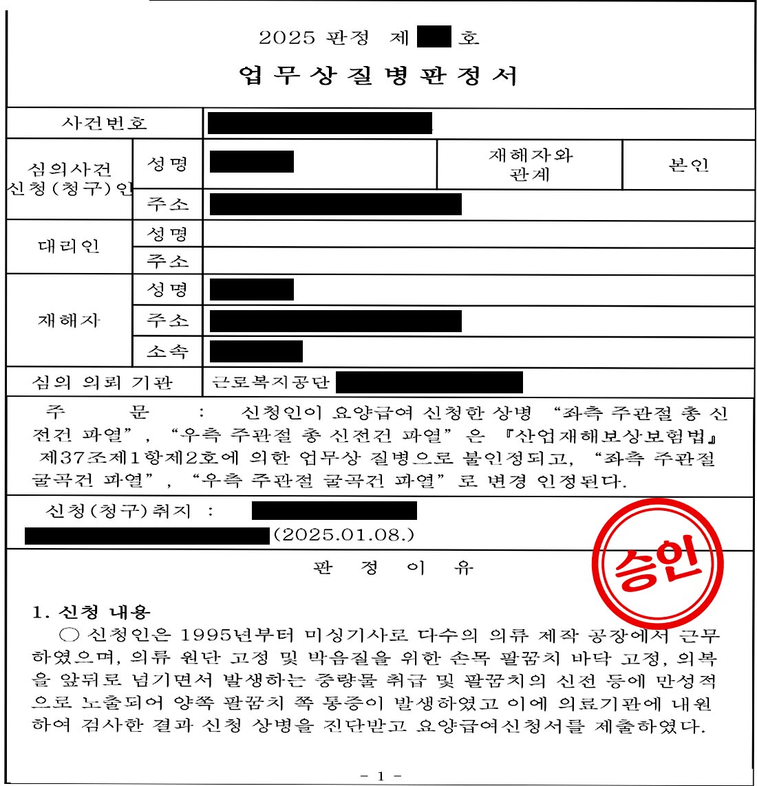 이번 사례는 초기 진단명과 최종 승인명이 달랐지만, 실제 작업 내용과 객관적 영상 소견을 촘촘히 연결해 업무상 재해로 인정받을 수 있음을 보여줍니다.