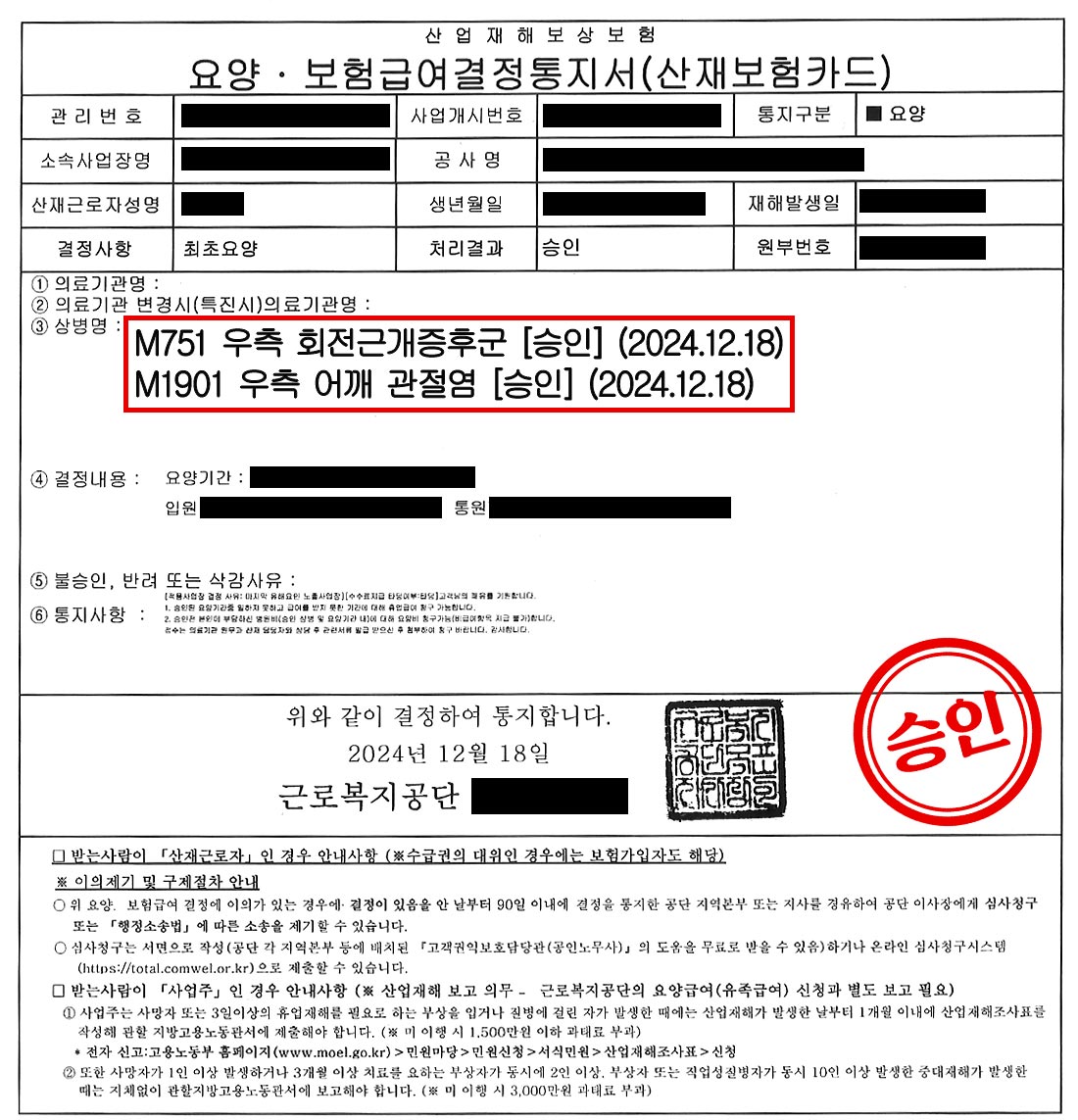 그 결과, ‘우측 회전근개증후군 및 우측 어깨 관절염’은 업무상 질병으로 최종 승인될 수 있었습니다.