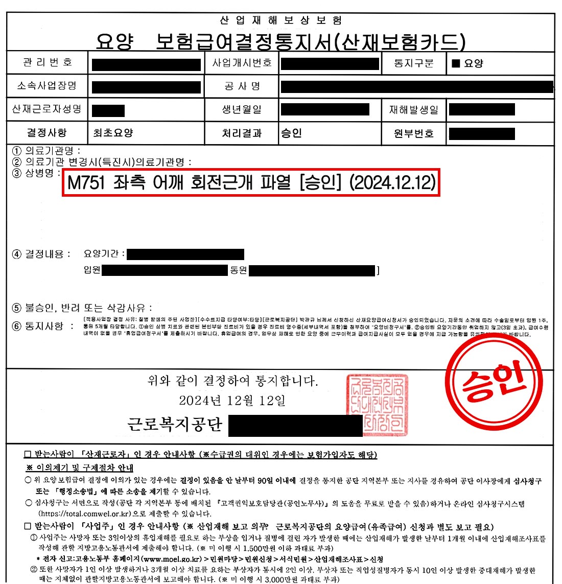 그 결과, ‘좌측 어깨 회전근개 파열’은 업무상 질병으로 최종 승인되었습니다.