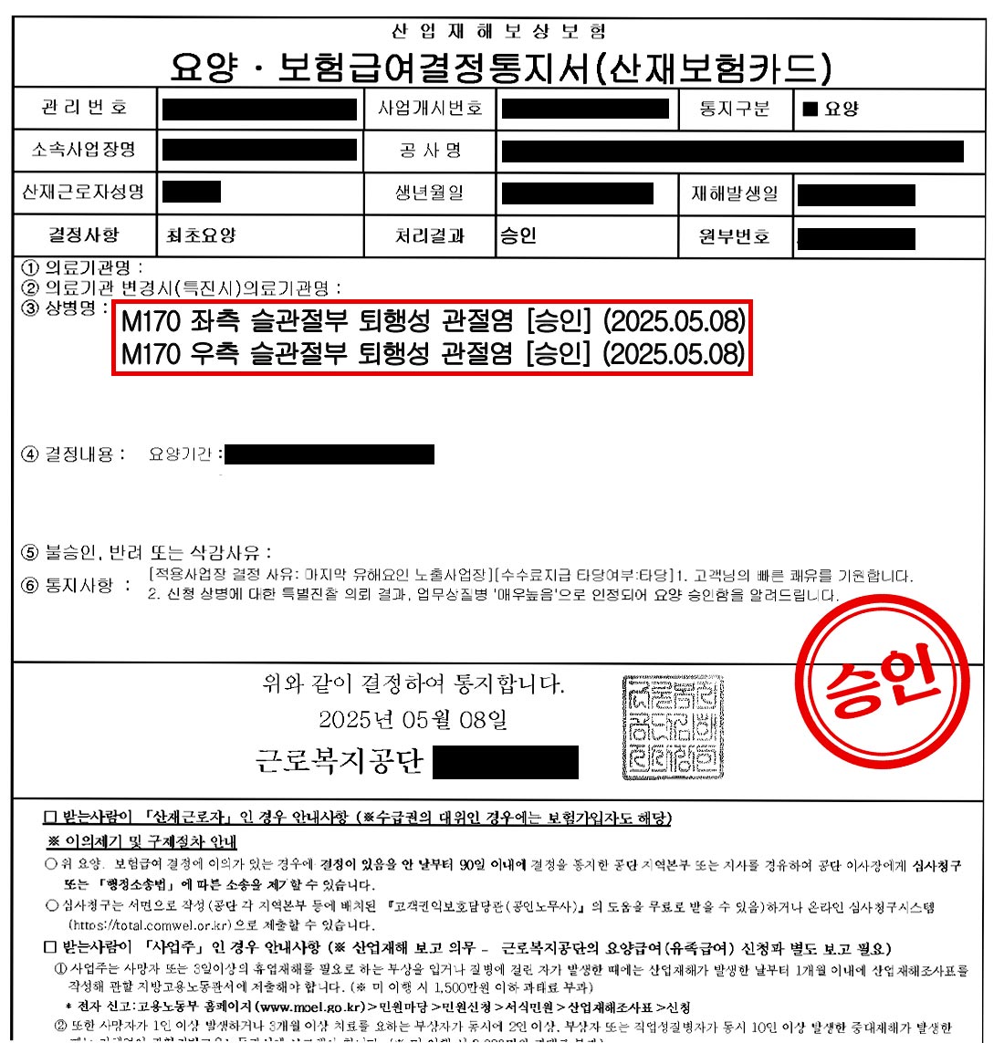 그 결과, 이 사건은 업무상질병판정위원회 심의가 생략되고 지사 자체적으로 신속하게 ‘양측 슬관절부 퇴행성 관절염’에 대해 업무상 질병으로 승인되는 최상의 결과를 얻을 수 있었습니다.