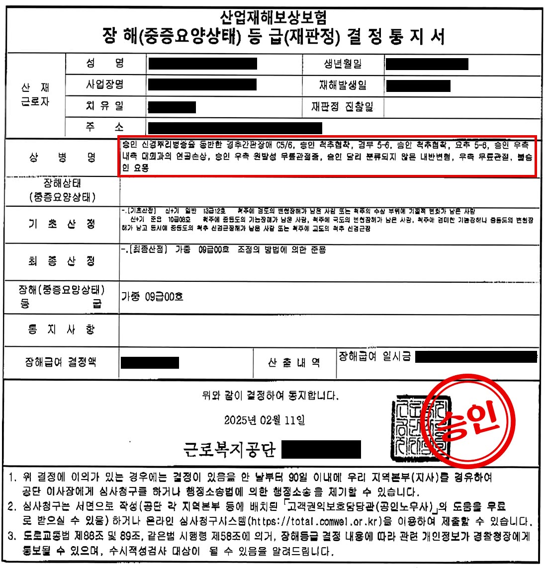 특히 경추 인공디스크 치환술과 같은 수술은 그 수술 자체만으로도 법령상 정해진 장해등급을 예상할 수 있습니다. 저희는 수술 기록만으로 장해등급 심사를 요청하여, 고인의 상태가 장해급여 지급 대상에 해당함을 적극적으로 주장했습니다.