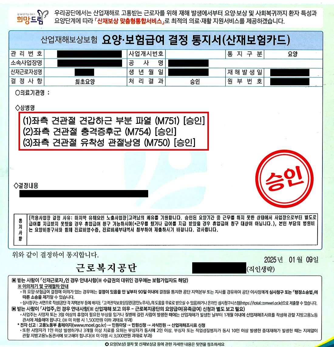 그 결과, ‘좌측 견관절 견갑하근 부분파열’과 ‘충돌증후군’은 물론, 이차성 질환으로 판단된 ‘좌측 견관절 유착성 관절낭염’까지 모두 업무상 질병으로 최종 승인되었습니다.