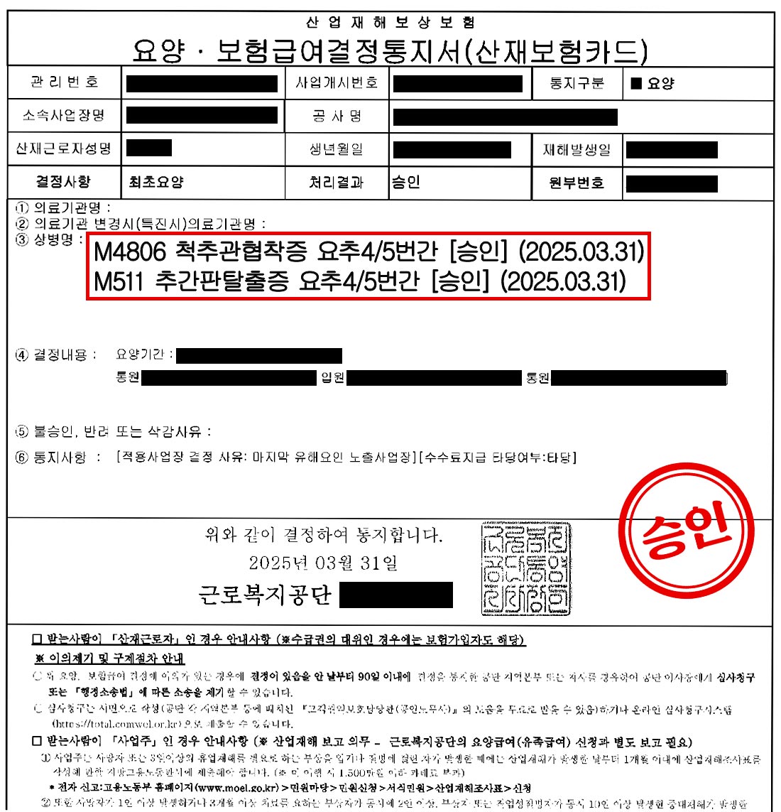 그 결과, ‘요추 4-5번 척추관 협착증 및 추간판 탈출증’은 업무상 질병으로 최종 승인되었습니다.