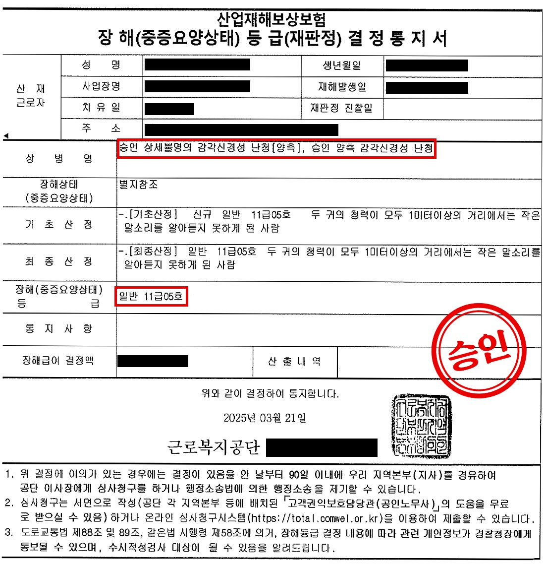 정보공개청구를 통해 확보한 객관적인 작업환경측정 결과 자료를 바탕으로, 의뢰인의 장기간 소음 노출 사실을 입증할 수 있었습니다. 그 결과, 위원회는 의뢰인의 소음성 난청을 업무상 질병으로 최종 승인하였습니다.