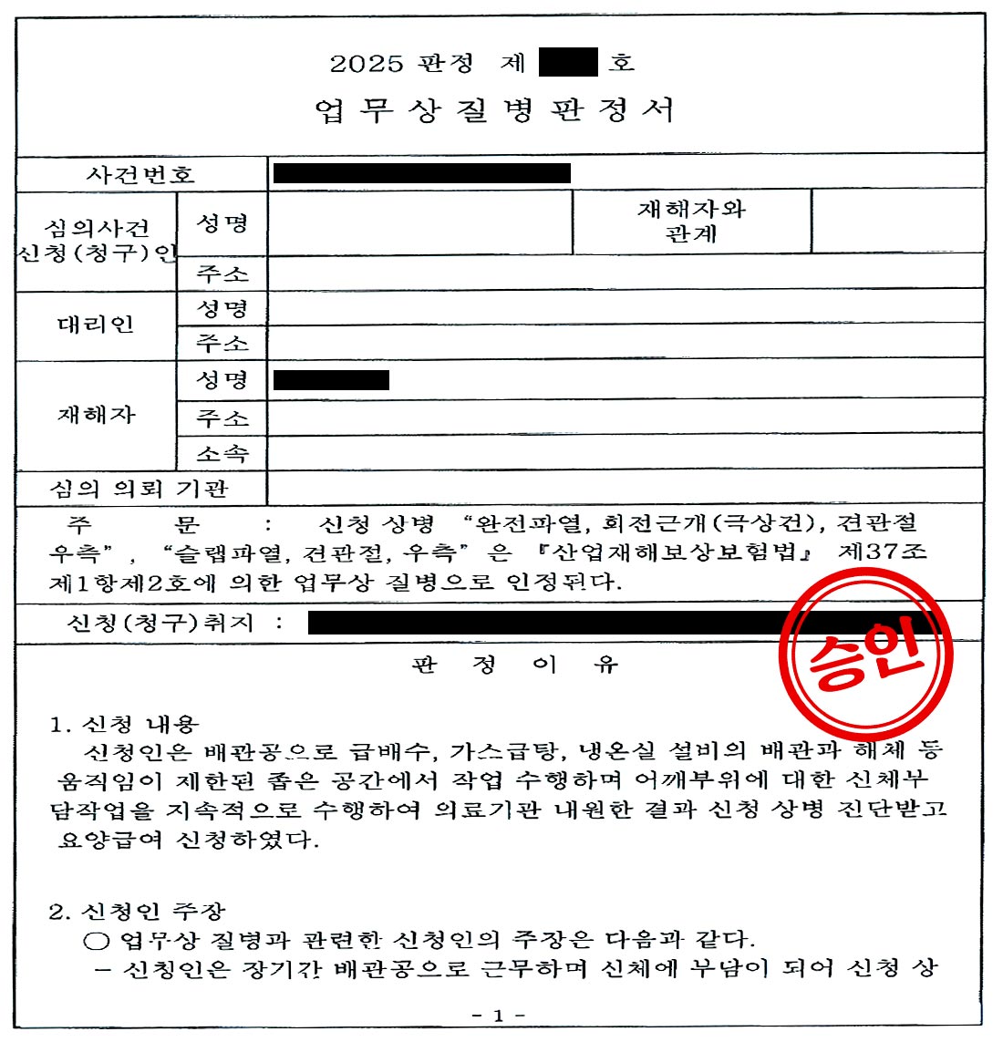 업무상질병판정위원회는 의뢰인의 "완전파열, 회전근개(극상건), 견관절 우측" 및 "슬랩파열, 견관절, 우측"을 모두 업무상 질병으로 최종 인정하였습니다.