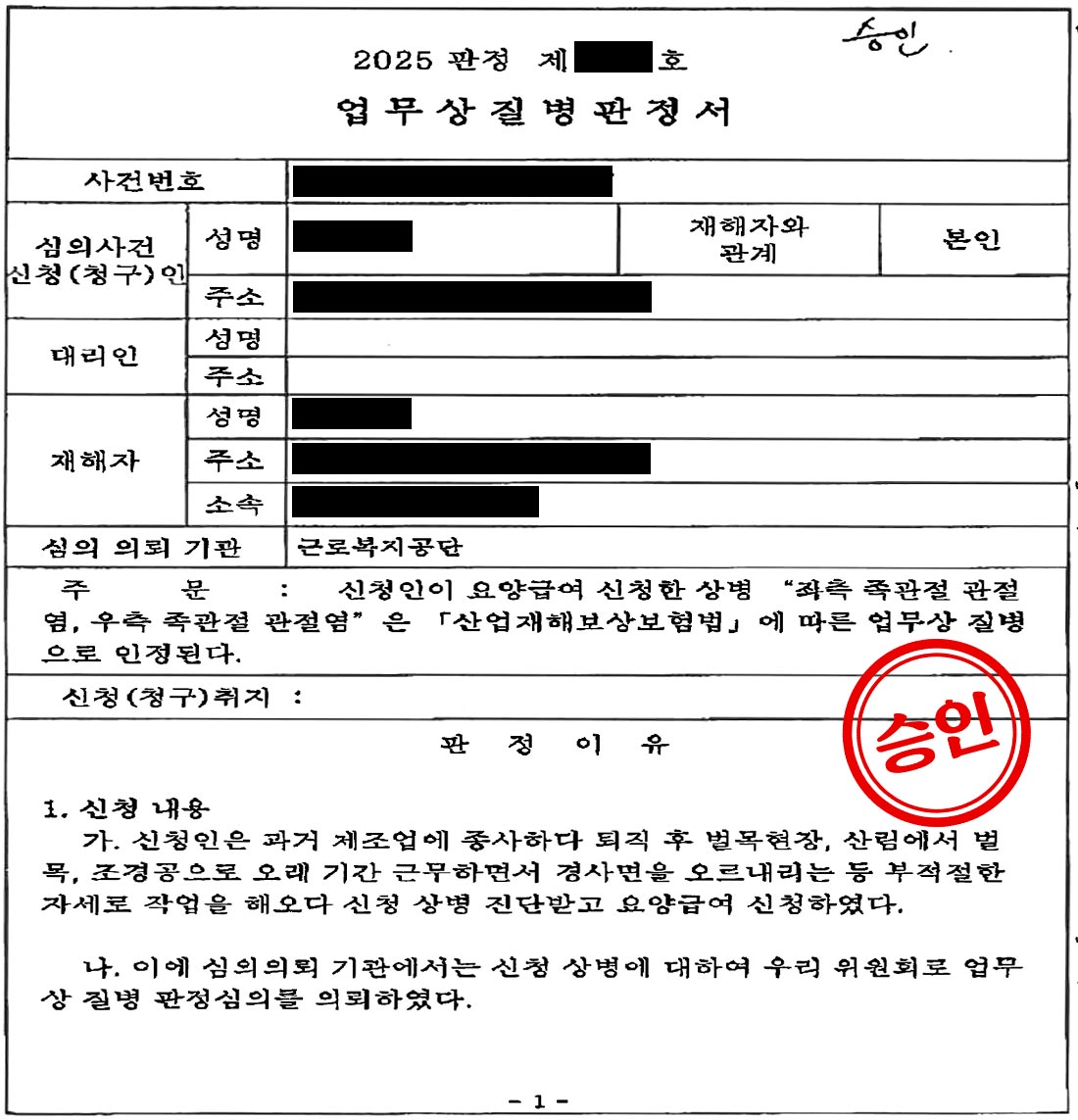 누락된 경력이 완벽히 채워지자, 더 이상의 이견은 없었습니다. 판정위원회는 저희의 주장을 모두 받아들여 만장일치로 업무상 질병을 인정했습니다.