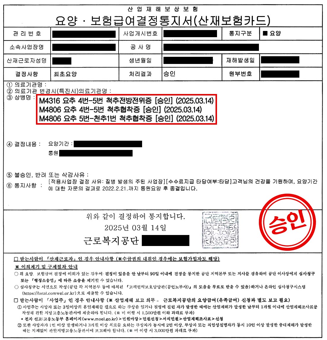 그 결과 신청하신 ‘요추 4번-5번 척추전방전위증’, ‘요추 4번-5번 척추협착증’, ‘요추 5번-천추1번 척추협착증’은 최종적으로 업무상 질병으로 승인되었습니다.