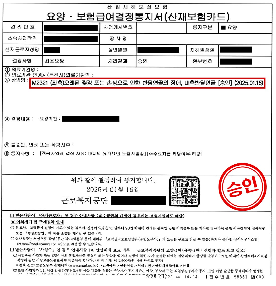 결과적으로 ‘(좌측)오래된 찢김 또는 손상으로 인한 반달연골의 장애, 내측반달연골’은 최종적으로 업무상 질병으로 승인되었습니다. 이로써 의뢰인은 무릎 치료에 대한 걱정을 덜고 회복에만 집중할 수 있게 되었습니다.