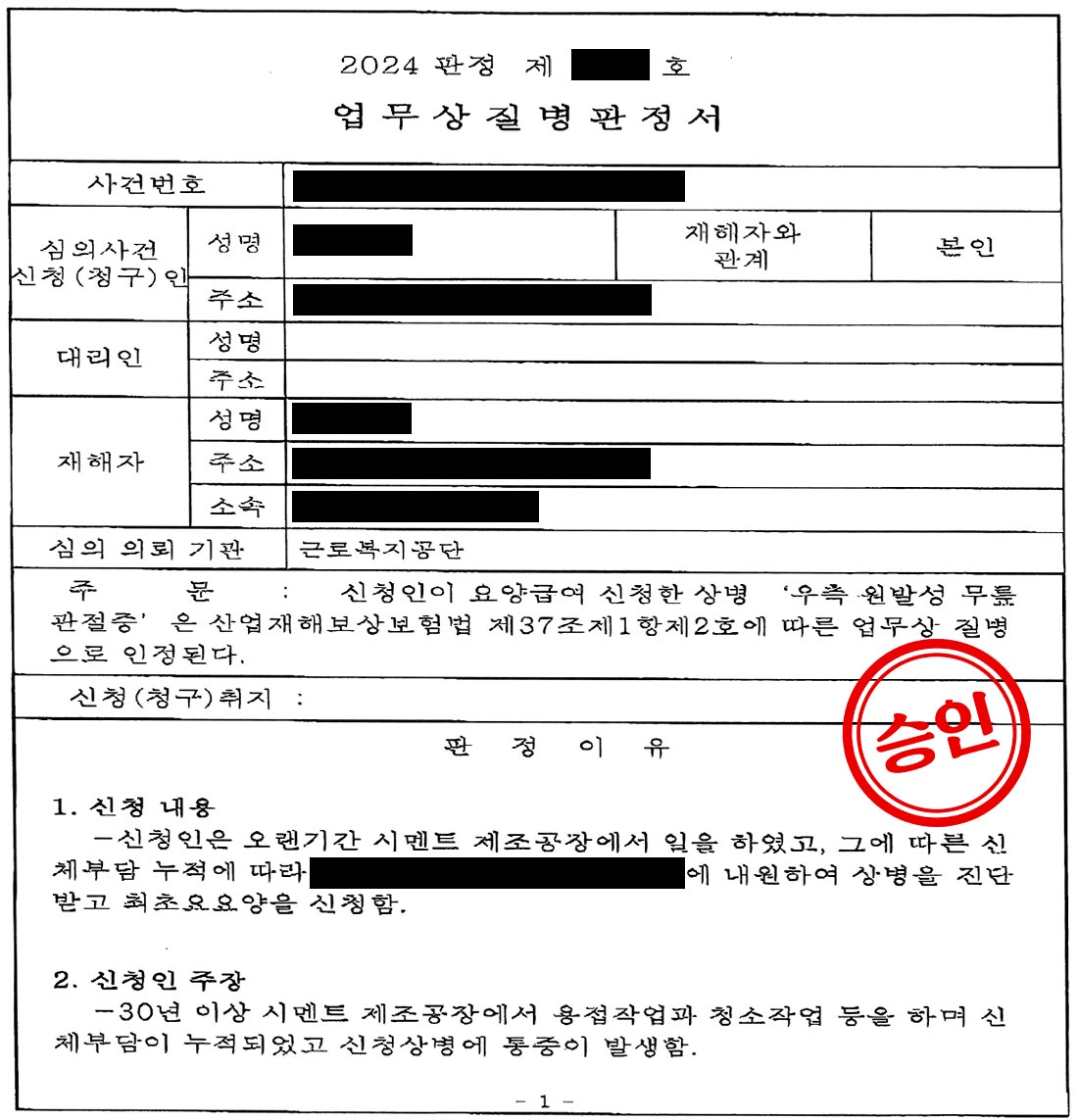 그 결과, 의뢰인의 ‘우측 원발성 무릎 관절염’은 업무상 질병으로 최종 인정되었습니다.