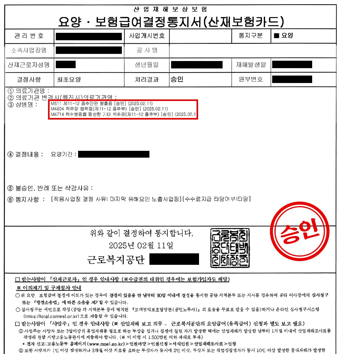 그 결과, ‘제11-12 흉추간판 탈출증’, ‘척추강 협착증(제11-12 흉추부)’ 및 ‘척수병증을 동반한 기타 척추증(제11-12 흉추부)’은 업무상 질병으로 최종 승인되었습니다.