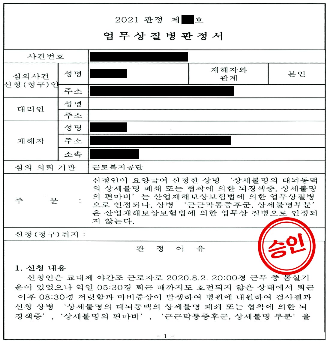 발병 전날 근무 중 몸살 기운을 느꼈지만 업무를 계속 수행했고, 퇴근 이후 우측 편마비 증상이 발생했습니다. 병원 검사 결과 ‘상세불명의 대뇌동맥의 상세불명 폐쇄 또는 협착에 의한 뇌경색증, 상세불명의 편마비, 근근막통증후군’을 진단 받았습니다.