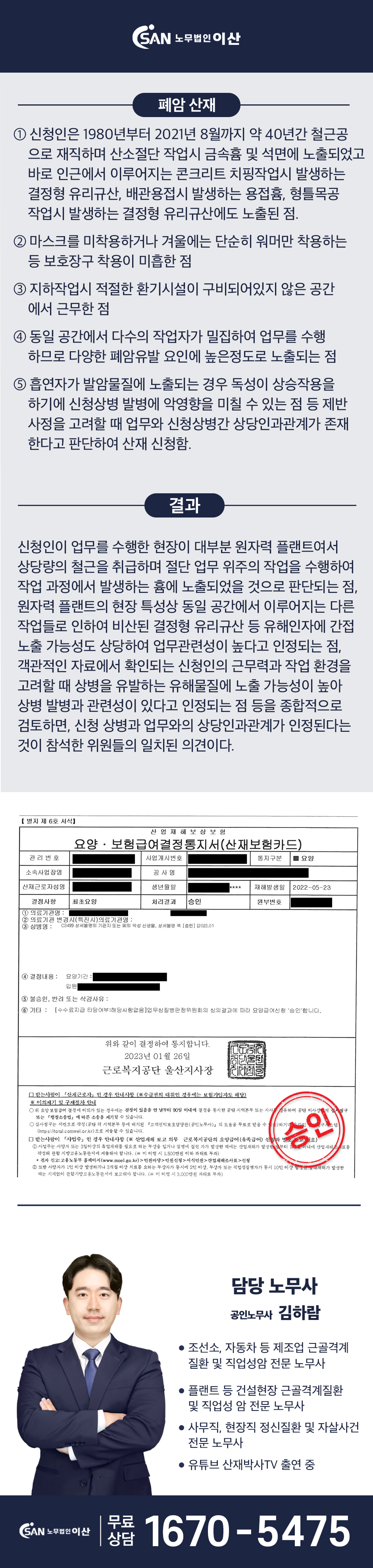 철근공 근무 금속 흄 및 석면 노출 근로자, 승인 결정서