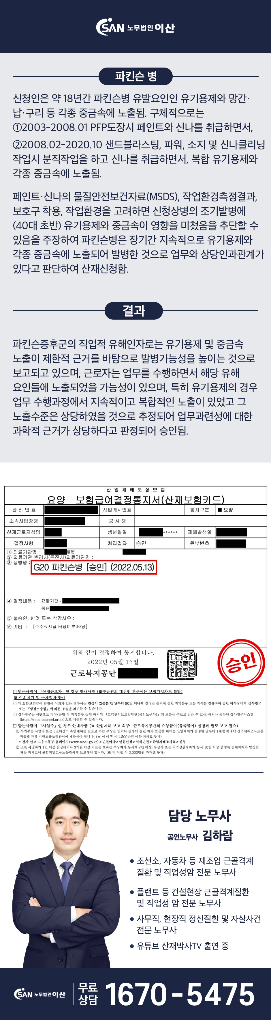 파킨슨병 산재, 승인 결정서