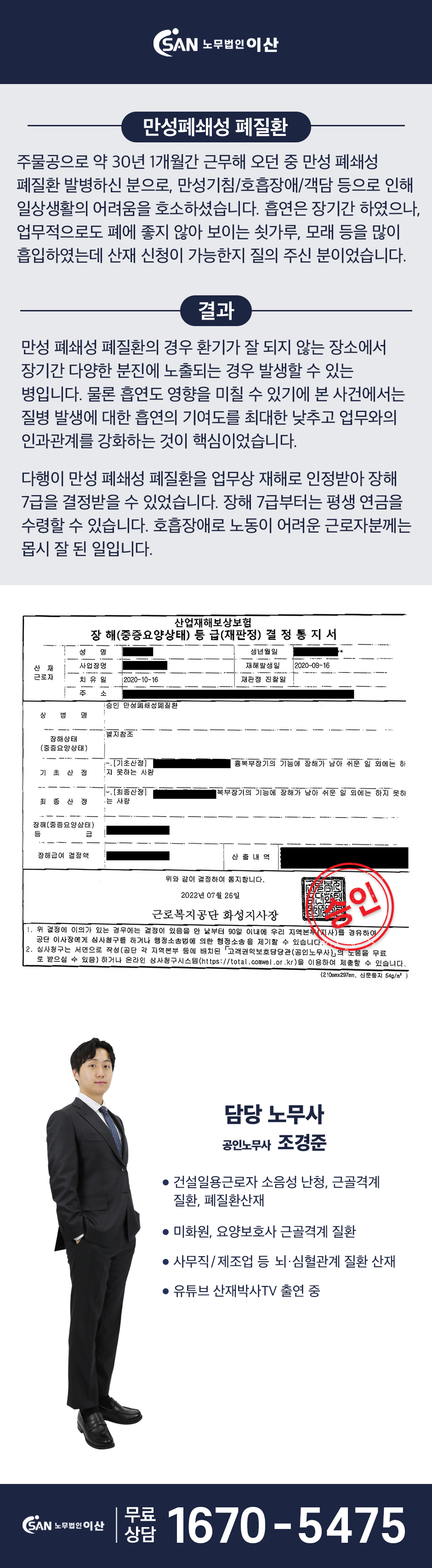 건설현장 인테리어공 폐암 산재 승인 사례 건설현장 인테리어공 폐암 산재 승인 사례 안녕하세요, 산재전문 노무법인 이산입니다. 건설현장은 다양한 공정이 동시에 이루어지는 공간입니다. 특히 인테리어 공사는 마감 단계에 속하지만, 그 과정에서 용접, 절단, 파쇄 등 여러 작업이 함께 이루어집니다. 오늘 소개해 드릴 사례는 건설현장에서 인테리어공으로 근무하시던 고인이 폐암 진단을 받은 후, 유족이 산재를 신청하여 업무상 질병으로 인정받은 사건입니다. Ⅰ. 사건의 배경 고인은 오랜 기간 건설현장에서 인테리어 및 내장 공사 업무를 수행해 왔습니다. 작업 내용에는 창호 시공, 용접 업무, 실내 마감 작업 등이 포함되어 있었고, 공정에 따라 다양한 작업 환경을 경험하였습니다. 폐암 진단 이후 치료가 이어졌으나, 고인은 끝내 세상을 떠났습니다. 남겨진 유족은 고인의 업무와 질병 사이의 관련성을 밝히기 위해 산재 절차를 시작하였습니다. Ⅱ. 사건의 쟁점 및 해결방법1. “실내 인테리어 작업인데도 유해물질 노출이 인정될 수 있을까요?”쟁점 : 위원회에서는 고인의 주 업무를 ‘실내 인테리어 작업’으로 보았습니다. 이에 따라 용접 흄이나 유해 분진에 대한 노출 수준이 충분했는지가 쟁점이 되었습니다. 해결 전략 :저희는 인테리어 공사가 단순한 마감 작업에 그치지 않는다는 점을 설명했습니다. 현장 상황에 따라 콘크리트 파쇄 작업이 이루어질 수 있고, 이 과정에서 결정형 유리규산에 노출될 가능성이 있다는 점, 또한 실내 공간에서 용접 작업이 이루어질 경우 고농도 용접 흄에 노출될 수 있다는 점을 구체적으로 정리했습니다. 2. “경력 기간을 어떻게 평가해야 할까요?”쟁점 :객관적으로 확인되는 건설근로 경력 자료와, 청구인이 주장하는 전체 직업력 사이에는 차이가 있었습니다. 경력의 범위와 기간을 어떻게 볼 것인지가 판단의 중요한 요소였습니다. 해결 전략 :저희는 건설근로자 경력증명서, 고용보험 일용근로 내역, 원천징수 자료 등을 종합하여 고인의 건설업 종사 이력을 정리했습니다. 특히 인테리어 및 용접 관련 업무 내용이 반복적으로 확인된다는 점을 강조하며, 장기간 관련 직무에 종사하였음을 설명했습니다. 3. “폐암과 업무 사이의 인과관계는 어떻게 판단되었나요?”쟁점 :소수 위원은 고인의 업무가 폐암을 유발하거나 악화시켰다고 보기 어렵다는 의견을 제시하였습니다. 노출 기간과 수준을 엄격하게 해석한 결과였습니다. 해결 전략 :반면 다수 위원은 다음과 같은 점을 종합적으로 고려하였습니다.- 인테리어 및 내장 공사 과정에서 발생 가능한 분진 노출- 실내 작업 특성상 용접 흄이 체류할 수 있는 환경- 관련 직무에 장기간 종사한 점이러한 사정을 종합하면 업무와 폐암 사이의 상당인과관계를 인정할 수 있다는 판단이 내려졌습니다. Ⅲ. 사건수행 결과 위원회는 고인의 업무 내용, 근무 형태, 작업 환경, 연령 및 건강 상태, 과거 병력, 의무기록과 영상자료, 재해조사서 및 전문 자문 의견 등을 종합적으로 검토하였습니다. 그 결과, 고인의 상병인 ‘상세불명의 기관지 또는 폐의 악성 신생물’은 업무와 상당인과관계가 인정되어 산업재해보상보험법에 따른 업무상 질병으로 승인되었습니다. 이에 따라 유족은 관련 급여를 지급받을 수 있게 되었습니다. Ⅳ. 산재전문노무사 의견 건설현장의 인테리어 작업은 겉으로 보기에는 비교적 정돈된 공정처럼 보일 수 있습니다. 그러나 실제로는 다양한 공정과 맞물려 유해요인에 노출될 가능성이 존재합니다. 이번 사건은 단순히 ‘실내 작업’이라는 이유만으로 업무 관련성을 배제할 수 없다는 점을 보여준 사례입니다. 작업의 실제 내용과 환경을 얼마나 구체적으로 설명하느냐가 판단의 핵심이었습니다. 유족의 용기 있는 결정과, 자료를 하나씩 정리해 나간 과정이 결국 승인으로 이어졌습니다.