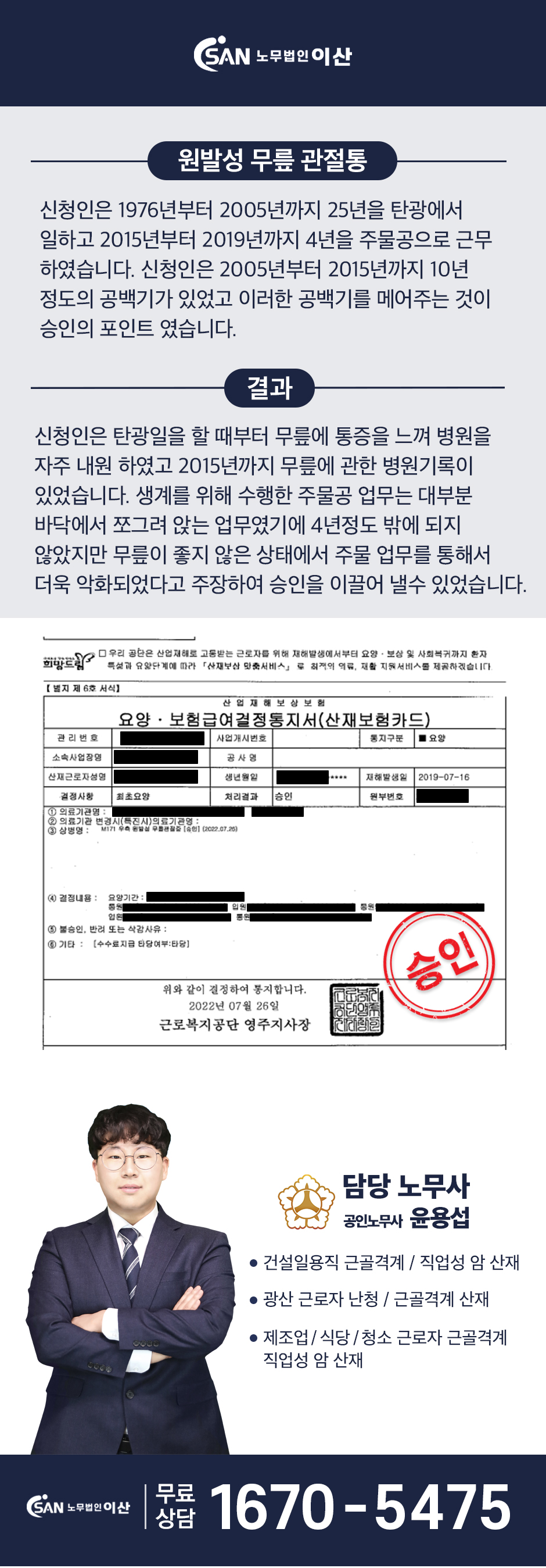 탄광 25년 근로자(광부) - 원발성 무릎관절증 산재 승인