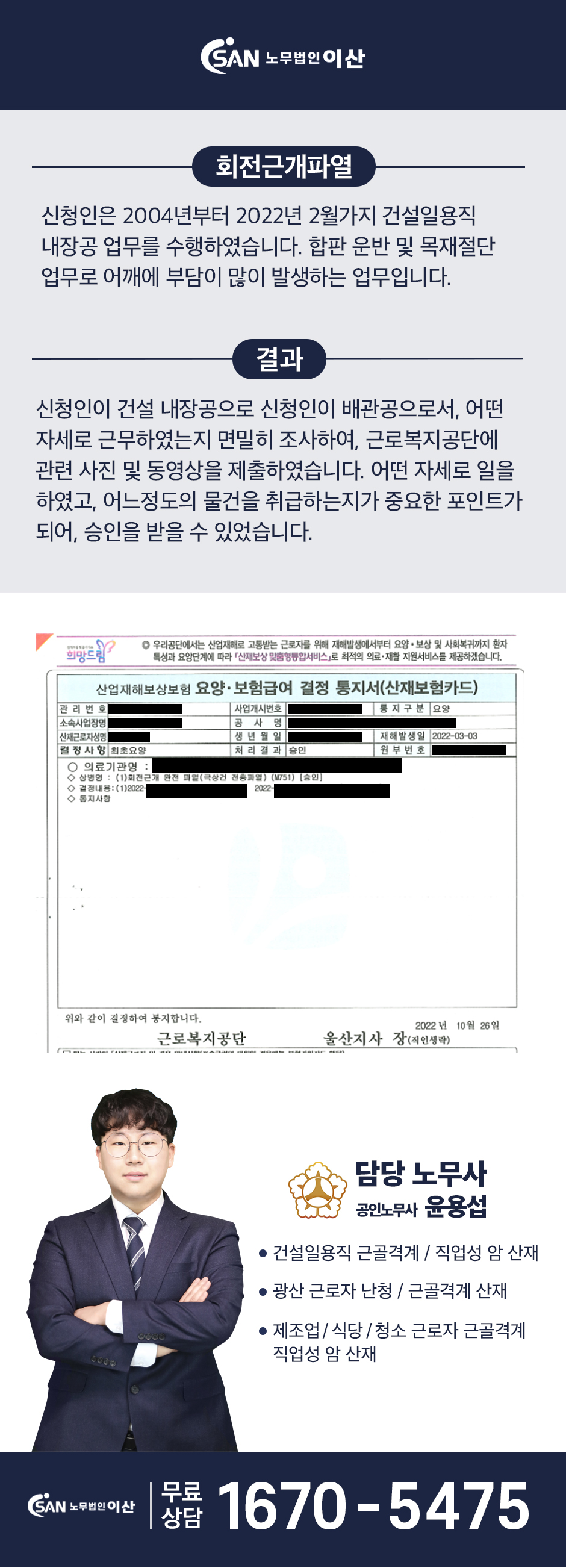 건설일용직 내장공 업무 근로자 : 회전근개파열 산재 승인