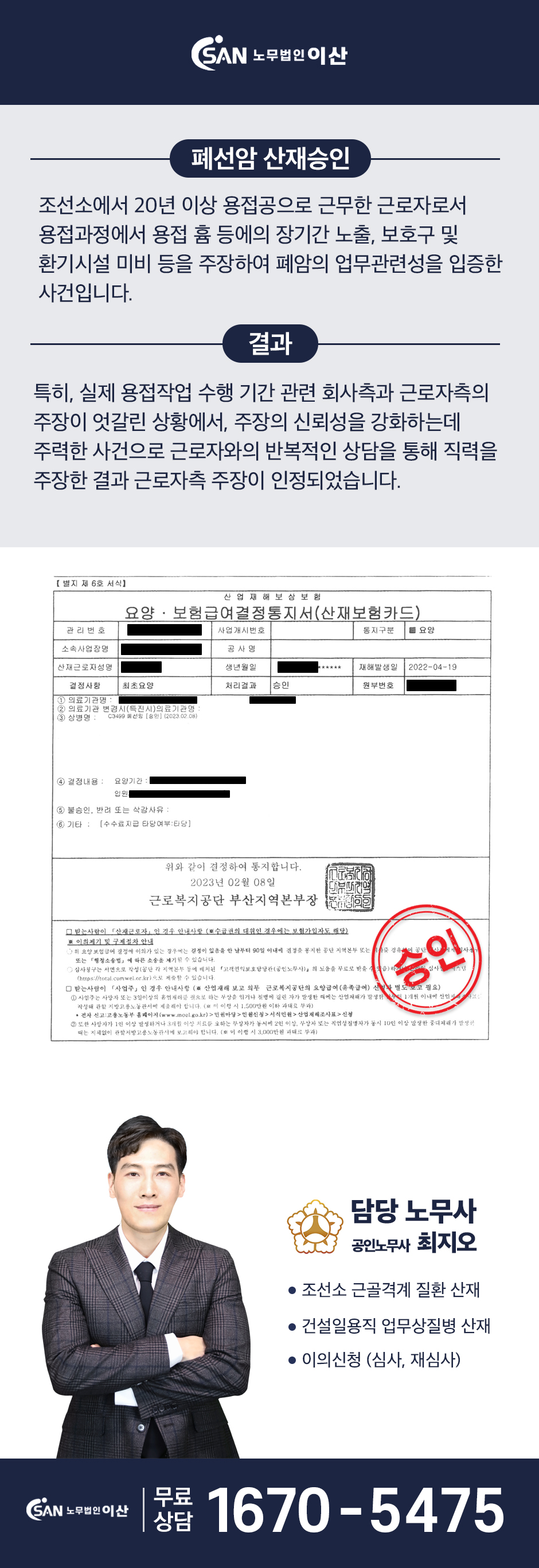 건설현장 인테리어공 폐암 산재 승인 사례 건설현장 인테리어공 폐암 산재 승인 사례 안녕하세요, 산재전문 노무법인 이산입니다. 건설현장은 다양한 공정이 동시에 이루어지는 공간입니다. 특히 인테리어 공사는 마감 단계에 속하지만, 그 과정에서 용접, 절단, 파쇄 등 여러 작업이 함께 이루어집니다. 오늘 소개해 드릴 사례는 건설현장에서 인테리어공으로 근무하시던 고인이 폐암 진단을 받은 후, 유족이 산재를 신청하여 업무상 질병으로 인정받은 사건입니다. Ⅰ. 사건의 배경 고인은 오랜 기간 건설현장에서 인테리어 및 내장 공사 업무를 수행해 왔습니다. 작업 내용에는 창호 시공, 용접 업무, 실내 마감 작업 등이 포함되어 있었고, 공정에 따라 다양한 작업 환경을 경험하였습니다. 폐암 진단 이후 치료가 이어졌으나, 고인은 끝내 세상을 떠났습니다. 남겨진 유족은 고인의 업무와 질병 사이의 관련성을 밝히기 위해 산재 절차를 시작하였습니다. Ⅱ. 사건의 쟁점 및 해결방법1. “실내 인테리어 작업인데도 유해물질 노출이 인정될 수 있을까요?”쟁점 : 위원회에서는 고인의 주 업무를 ‘실내 인테리어 작업’으로 보았습니다. 이에 따라 용접 흄이나 유해 분진에 대한 노출 수준이 충분했는지가 쟁점이 되었습니다. 해결 전략 :저희는 인테리어 공사가 단순한 마감 작업에 그치지 않는다는 점을 설명했습니다. 현장 상황에 따라 콘크리트 파쇄 작업이 이루어질 수 있고, 이 과정에서 결정형 유리규산에 노출될 가능성이 있다는 점, 또한 실내 공간에서 용접 작업이 이루어질 경우 고농도 용접 흄에 노출될 수 있다는 점을 구체적으로 정리했습니다. 2. “경력 기간을 어떻게 평가해야 할까요?”쟁점 :객관적으로 확인되는 건설근로 경력 자료와, 청구인이 주장하는 전체 직업력 사이에는 차이가 있었습니다. 경력의 범위와 기간을 어떻게 볼 것인지가 판단의 중요한 요소였습니다. 해결 전략 :저희는 건설근로자 경력증명서, 고용보험 일용근로 내역, 원천징수 자료 등을 종합하여 고인의 건설업 종사 이력을 정리했습니다. 특히 인테리어 및 용접 관련 업무 내용이 반복적으로 확인된다는 점을 강조하며, 장기간 관련 직무에 종사하였음을 설명했습니다. 3. “폐암과 업무 사이의 인과관계는 어떻게 판단되었나요?”쟁점 :소수 위원은 고인의 업무가 폐암을 유발하거나 악화시켰다고 보기 어렵다는 의견을 제시하였습니다. 노출 기간과 수준을 엄격하게 해석한 결과였습니다. 해결 전략 :반면 다수 위원은 다음과 같은 점을 종합적으로 고려하였습니다.- 인테리어 및 내장 공사 과정에서 발생 가능한 분진 노출- 실내 작업 특성상 용접 흄이 체류할 수 있는 환경- 관련 직무에 장기간 종사한 점이러한 사정을 종합하면 업무와 폐암 사이의 상당인과관계를 인정할 수 있다는 판단이 내려졌습니다. Ⅲ. 사건수행 결과 위원회는 고인의 업무 내용, 근무 형태, 작업 환경, 연령 및 건강 상태, 과거 병력, 의무기록과 영상자료, 재해조사서 및 전문 자문 의견 등을 종합적으로 검토하였습니다. 그 결과, 고인의 상병인 ‘상세불명의 기관지 또는 폐의 악성 신생물’은 업무와 상당인과관계가 인정되어 산업재해보상보험법에 따른 업무상 질병으로 승인되었습니다. 이에 따라 유족은 관련 급여를 지급받을 수 있게 되었습니다. Ⅳ. 산재전문노무사 의견 건설현장의 인테리어 작업은 겉으로 보기에는 비교적 정돈된 공정처럼 보일 수 있습니다. 그러나 실제로는 다양한 공정과 맞물려 유해요인에 노출될 가능성이 존재합니다. 이번 사건은 단순히 ‘실내 작업’이라는 이유만으로 업무 관련성을 배제할 수 없다는 점을 보여준 사례입니다. 작업의 실제 내용과 환경을 얼마나 구체적으로 설명하느냐가 판단의 핵심이었습니다. 유족의 용기 있는 결정과, 자료를 하나씩 정리해 나간 과정이 결국 승인으로 이어졌습니다.