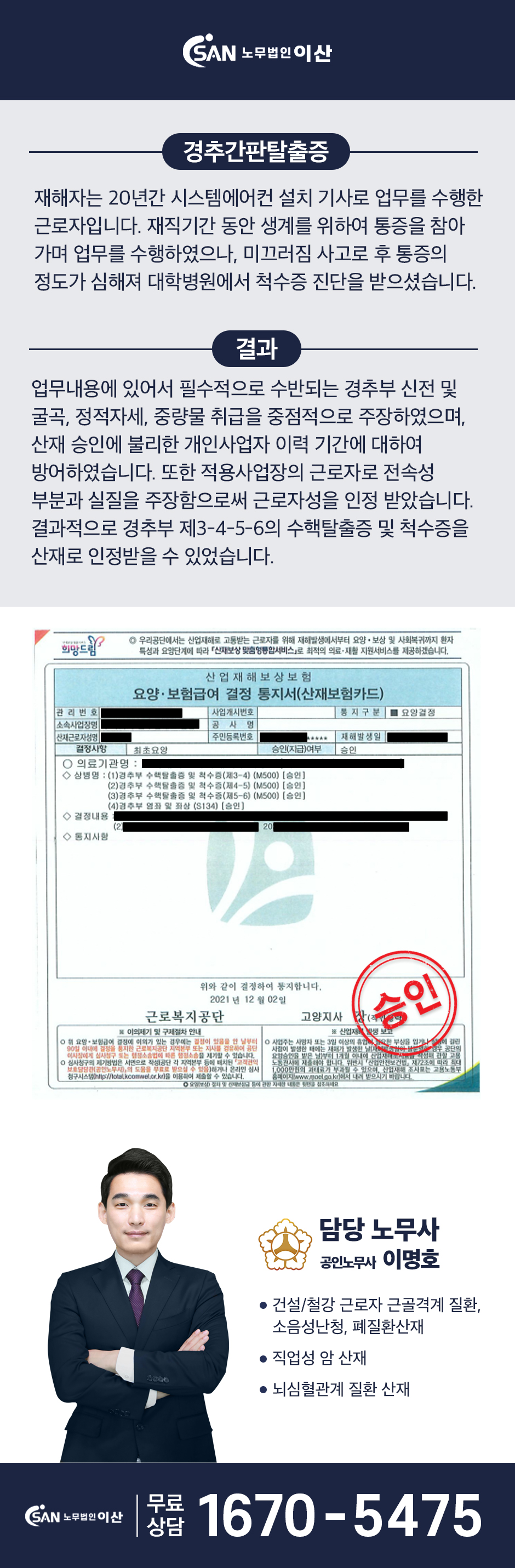 에어콘 설치기사 - 경추간판 탈출증 직업병 산재 승인