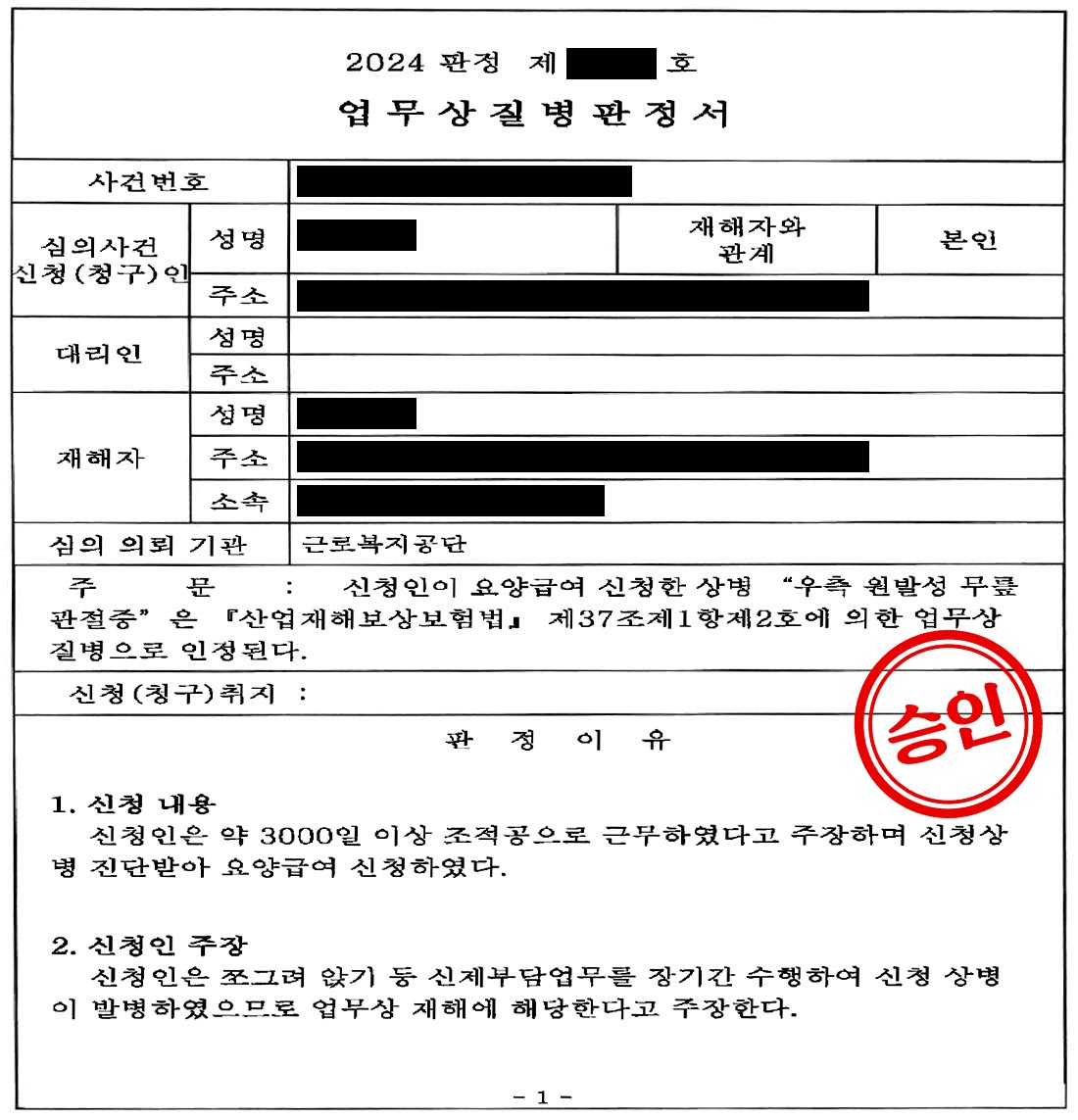 그 결과, ‘우측 원발성 무릎 관절증’은 업무상 질병으로 최종 승인되었습니다.